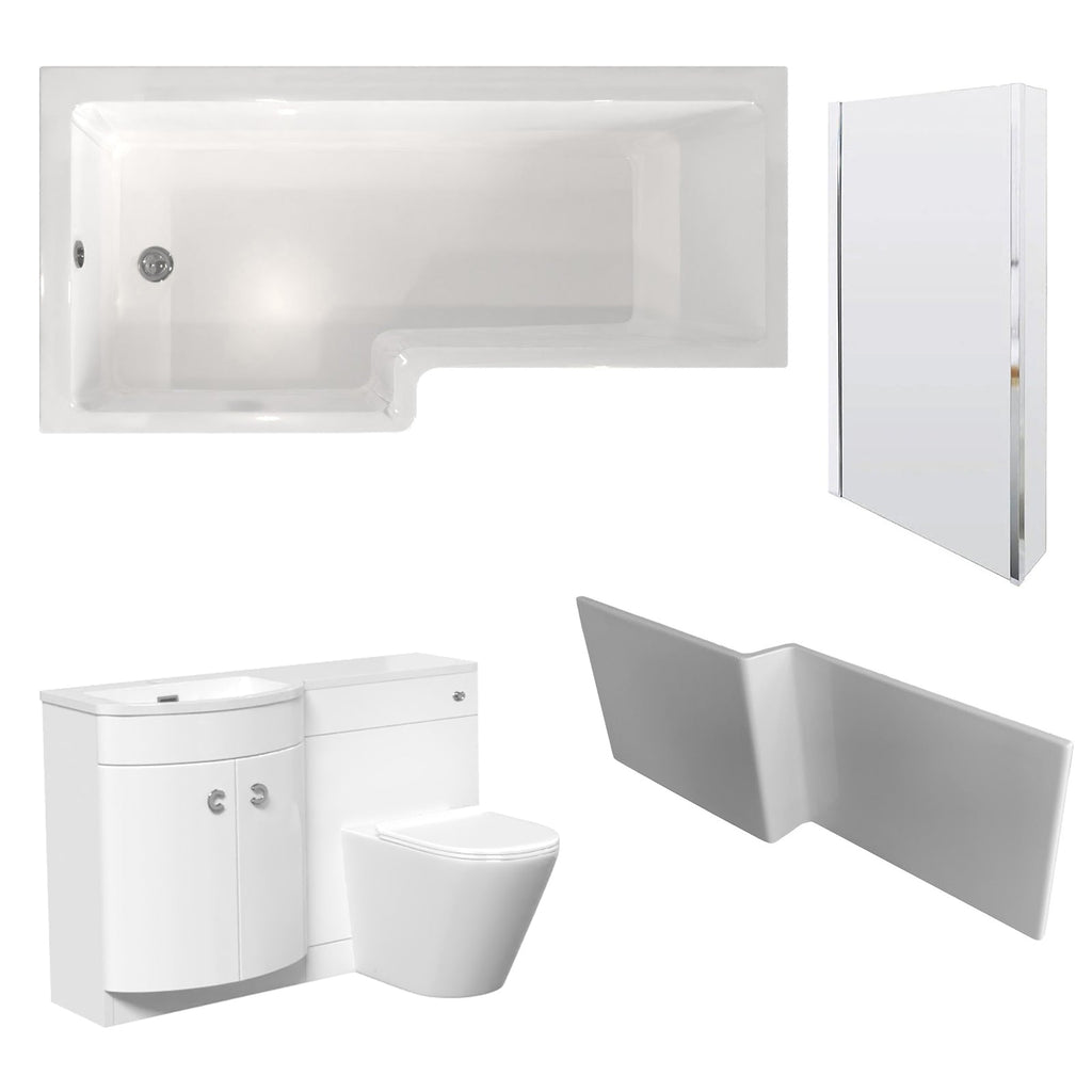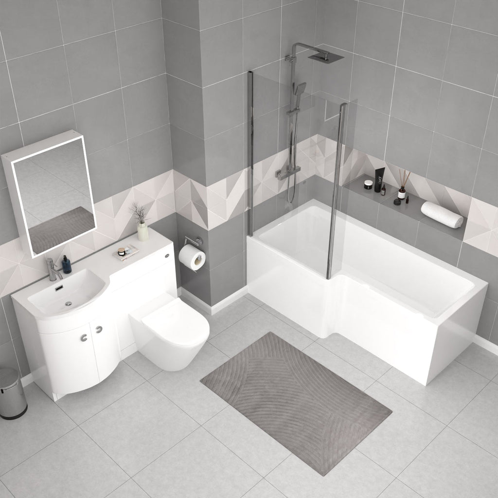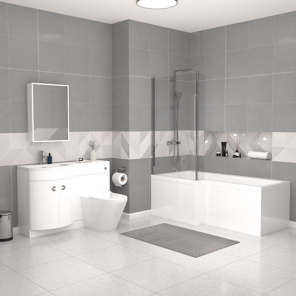 The Nes Home L-Shaped LH Shower Bath Set is a comprehensive bathroom solution that combines style and functionality. This set includes an L-shaped shower bath, a sleek white basin vanity unit, and a back-to-wall (BTW) toilet. The shower bath provides ample bathing space, while the basin vanity unit offers convenient storage and a modern aesthetic. The stylish Dene curved floor standing combination basin and WC unit with white poly marble basin top, modern white gloss bathroom furniture with two curved doors and contemporary chrome effect handles which will bring a trendy look to your bathroom.