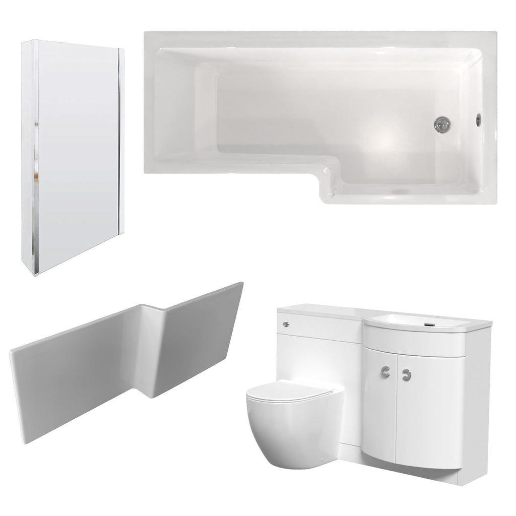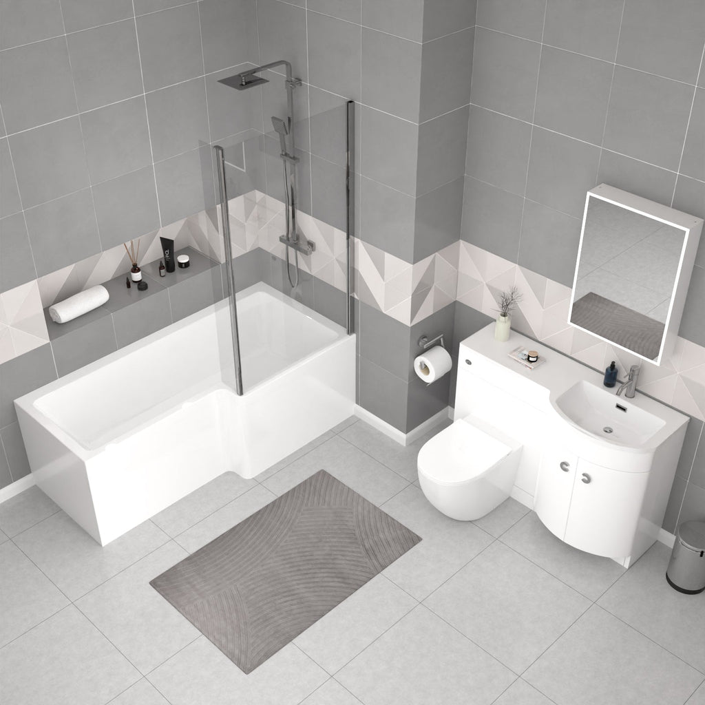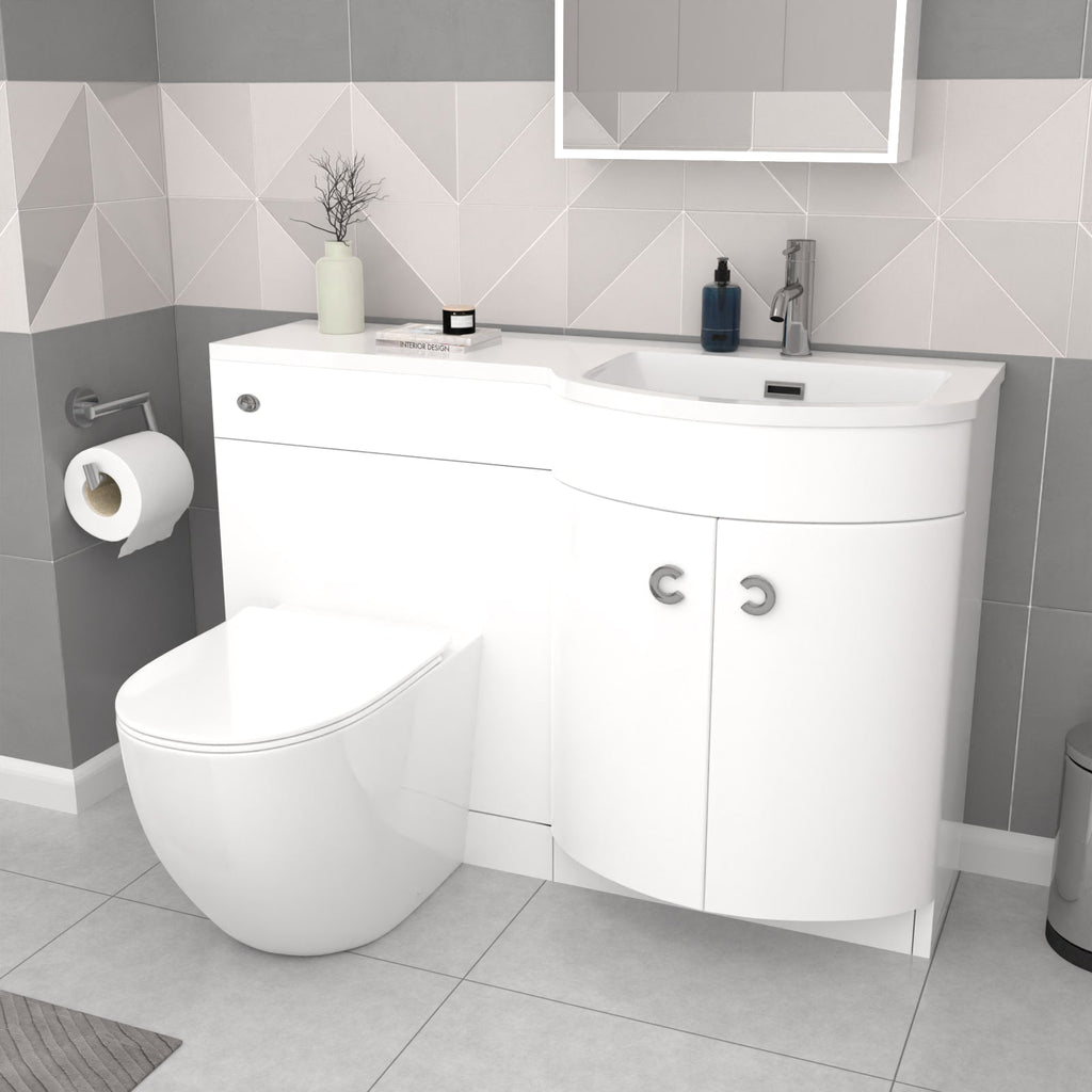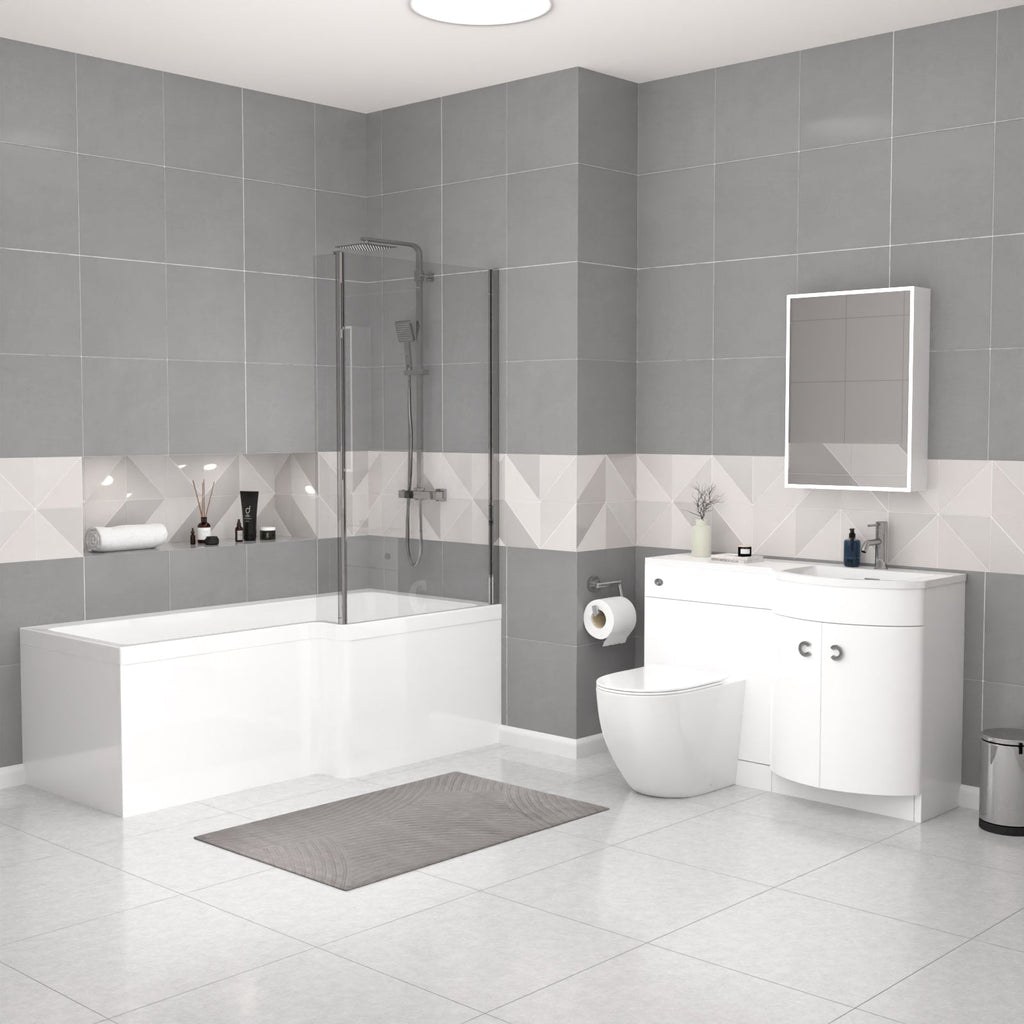 The Nes Home L-Shaped RH Shower Bath Set is a comprehensive bathroom solution that combines style and functionality. This set includes an L-shaped shower bath, a sleek white basin vanity unit, and a back-to-wall (BTW) toilet. The shower bath provides ample bathing space, while the basin vanity unit offers convenient storage and a modern aesthetic. The stylish Dene curved floor standing combination basin and WC unit with white poly marble basin top, modern white gloss bathroom furniture with two curved doors and contemporary chrome effect handles which will bring a trendy look to your bathroom.