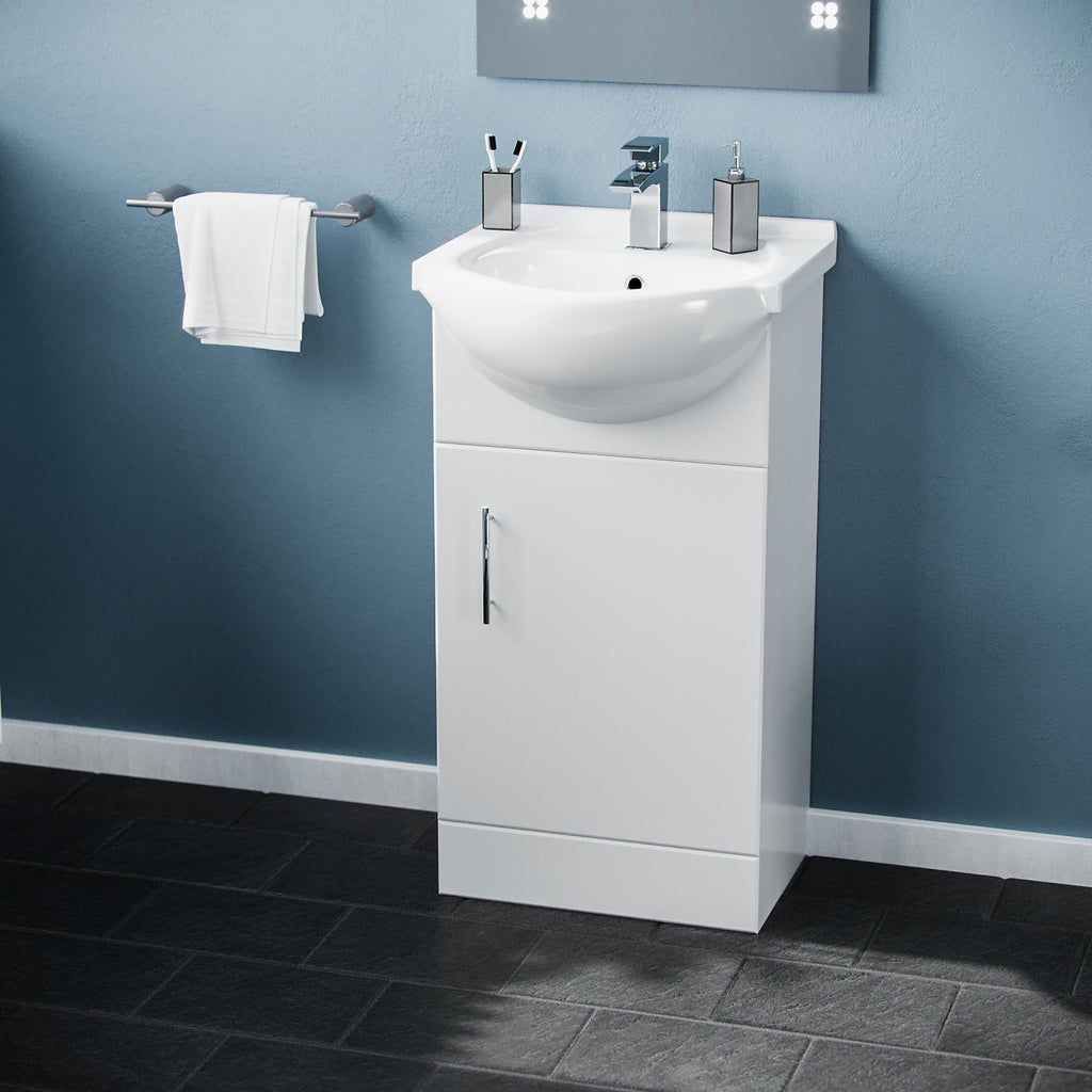 This beautiful 450 mm White and glossy freestanding basin vanity cabinet complete with a high-quality basin. Modern designer shape, this basin is made from white ceramic, covered with a high gloss finish which makes the basin stand out.