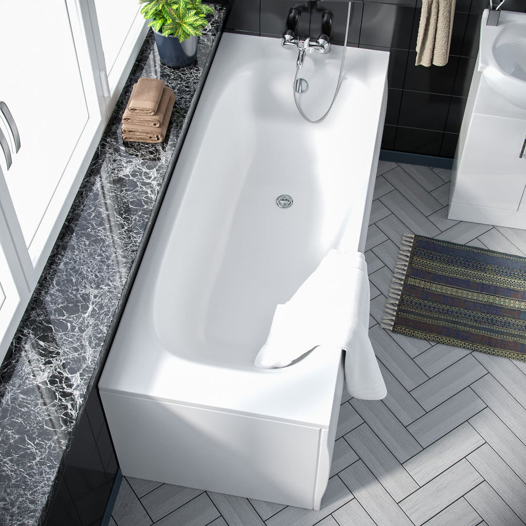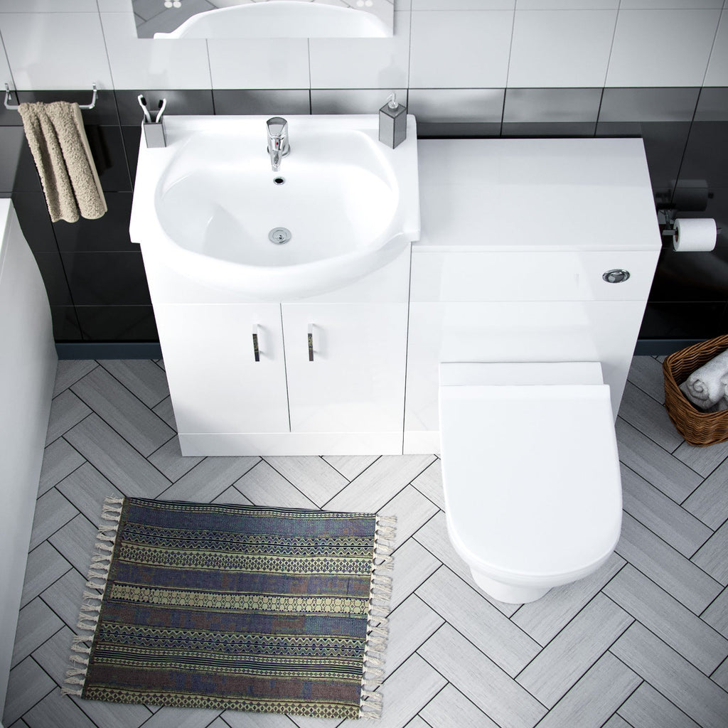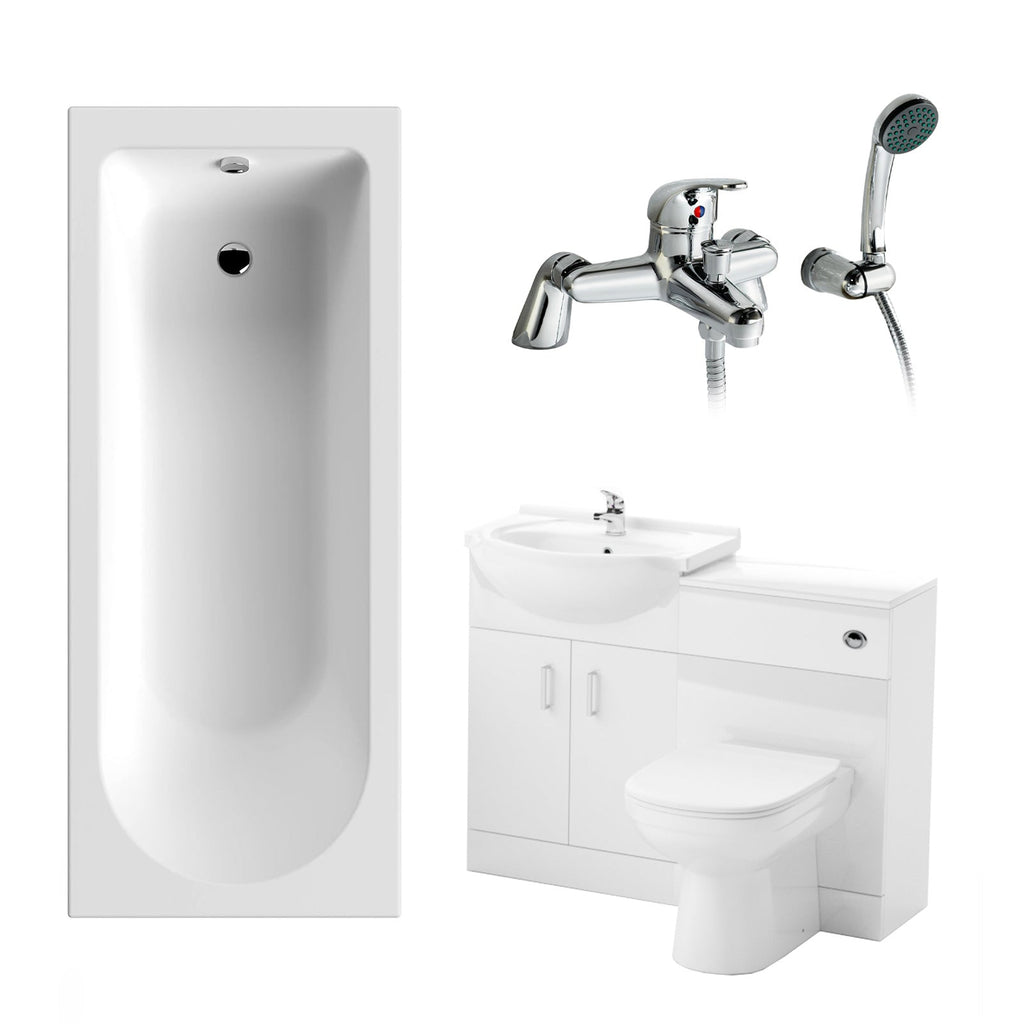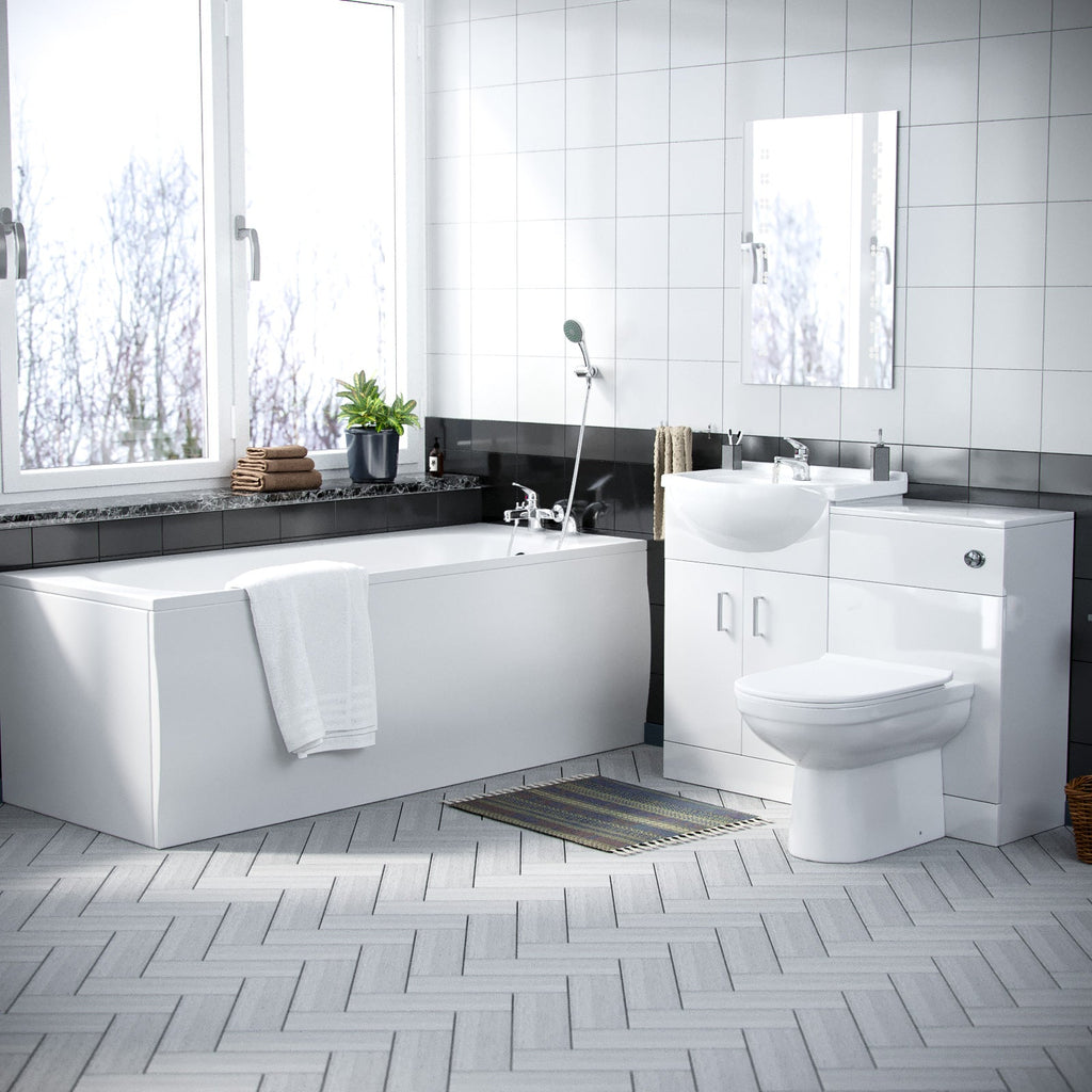 This modern suite features an Ellen elegant basin vanity unit, a luxurious 1700mm single-ended shower bath, and a contemporary curved toilet with a WC Unit to neatly hide the cistern. Experience the epitome of modern elegance with our Ellen Bathroom Suite in striking White Gloss and Chrome Handles.