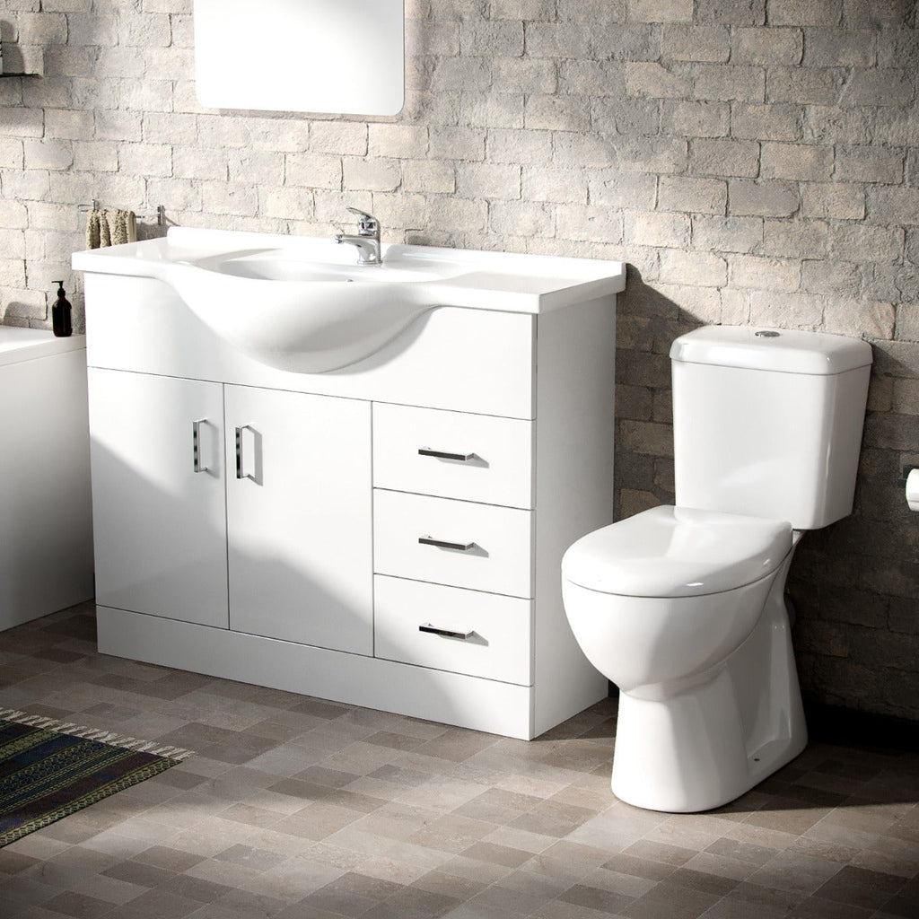 This white bathroom suite includes a sleek floor-standing vanity unit with integrated basin, a close-coupled toilet with dual flush cistern, and a bathtub. Perfect for modern bathrooms, this set offers practicality, ample storage, and a clean, minimalist design.