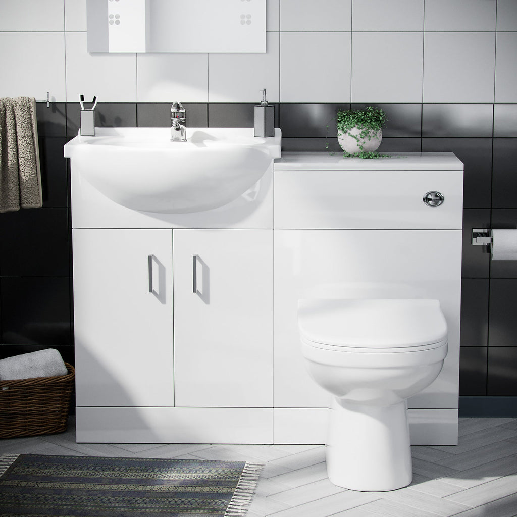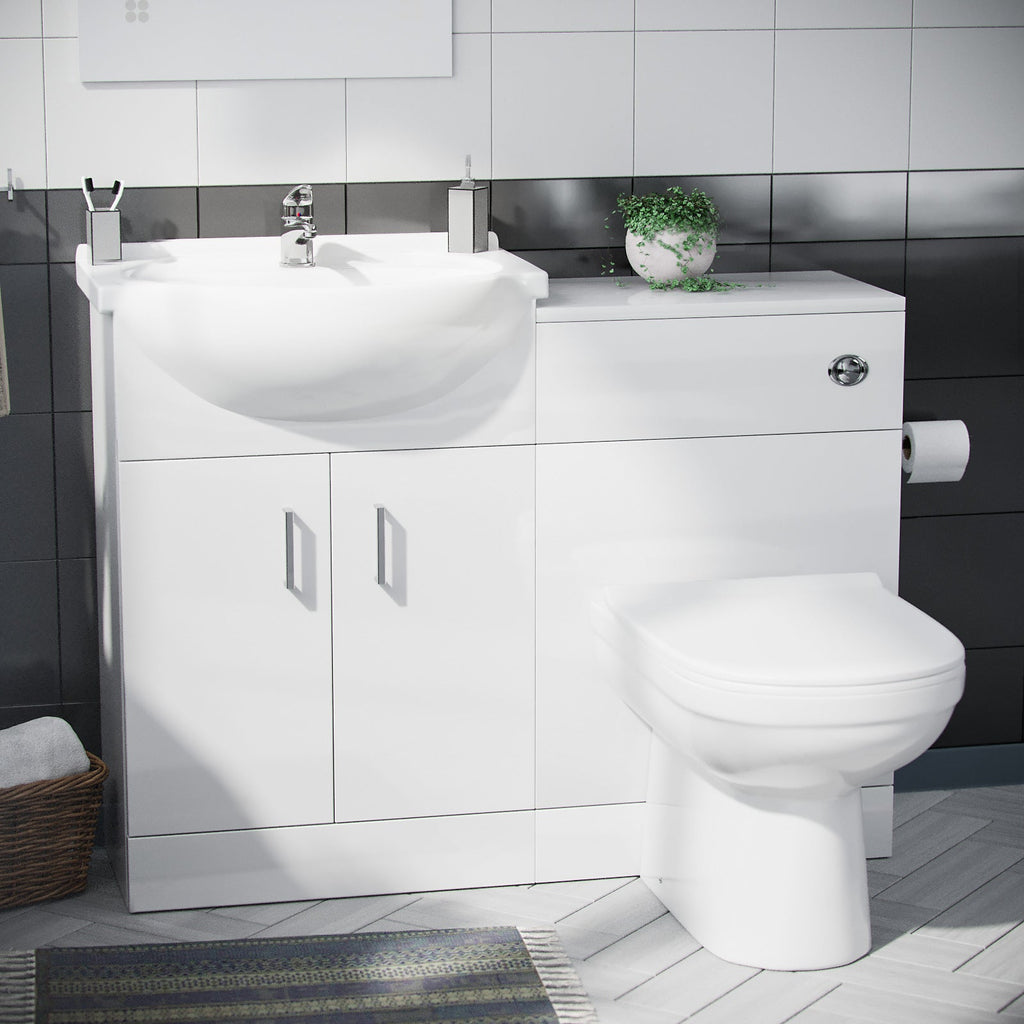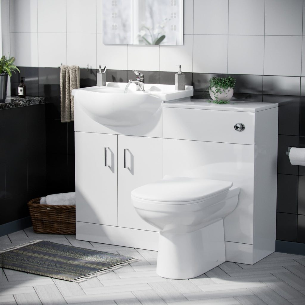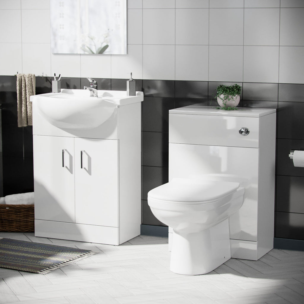 This stunning 550 mm white gloss Floor Standing basin vanity unit and back to wall WC toilet including Basin tap and waste 3 piece set, is the perfect choice for smaller bathrooms with limited space.
