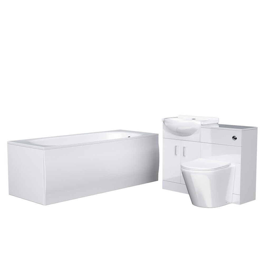 This beautiful bath suite comes with 550mm glossy white freestanding basin vanity cabinet, WC unit, and glossy white toilet as well as an acrylic bath tub. The ultra-modern designer shape back to wall toilet pan comes with a soft close seat cover and 10 years guarantee. This toilet is made from white ceramic, covered with a high gloss finish which makes the toilet stand out and the Bath is made from acrylic making the bath, durable and resistant to scratches and stains.