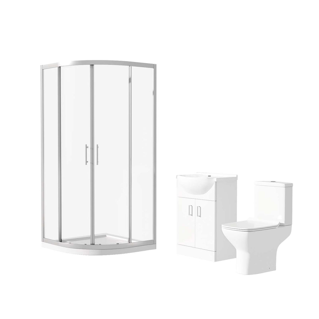 This unique complete shower bathroom suite is combined with our luxurious shower enclosure and a close-coupled toilet & basin vanity unit