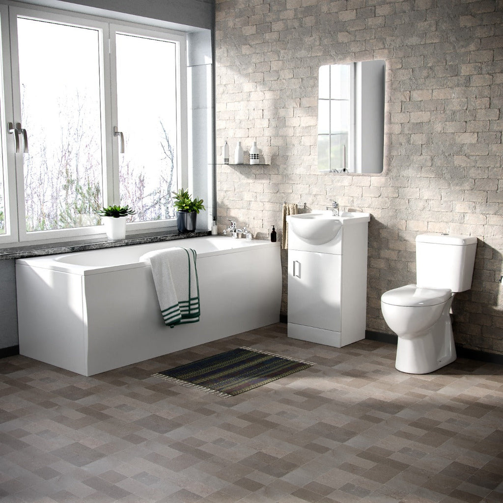 This compact white bathroom suite includes a space-saving vanity unit with basin, a close-coupled toilet with dual flush, and a sleek single-ended bathtub. Designed for smaller bathrooms or en-suites, it offers essential functionality with a clean, minimalist style.