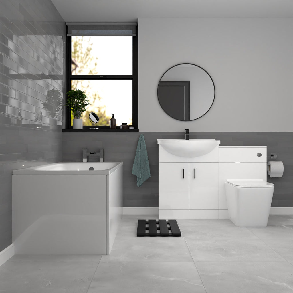 The White Basin Vanity, WC Unit, Square Back To Wall Toilet & 1700mm Bath is a stylish and functional bathroom furniture set including a sleek gloss white vanity that stands on the floor, providing ample space for washing and storage. The WC unit is designed to conceal the cistern and plumbing, creating a neat and cohesive look. Together with the back to wall toilet, these furniture combinations create a modern and practical bathroom that enhances both aesthetics and functionality.