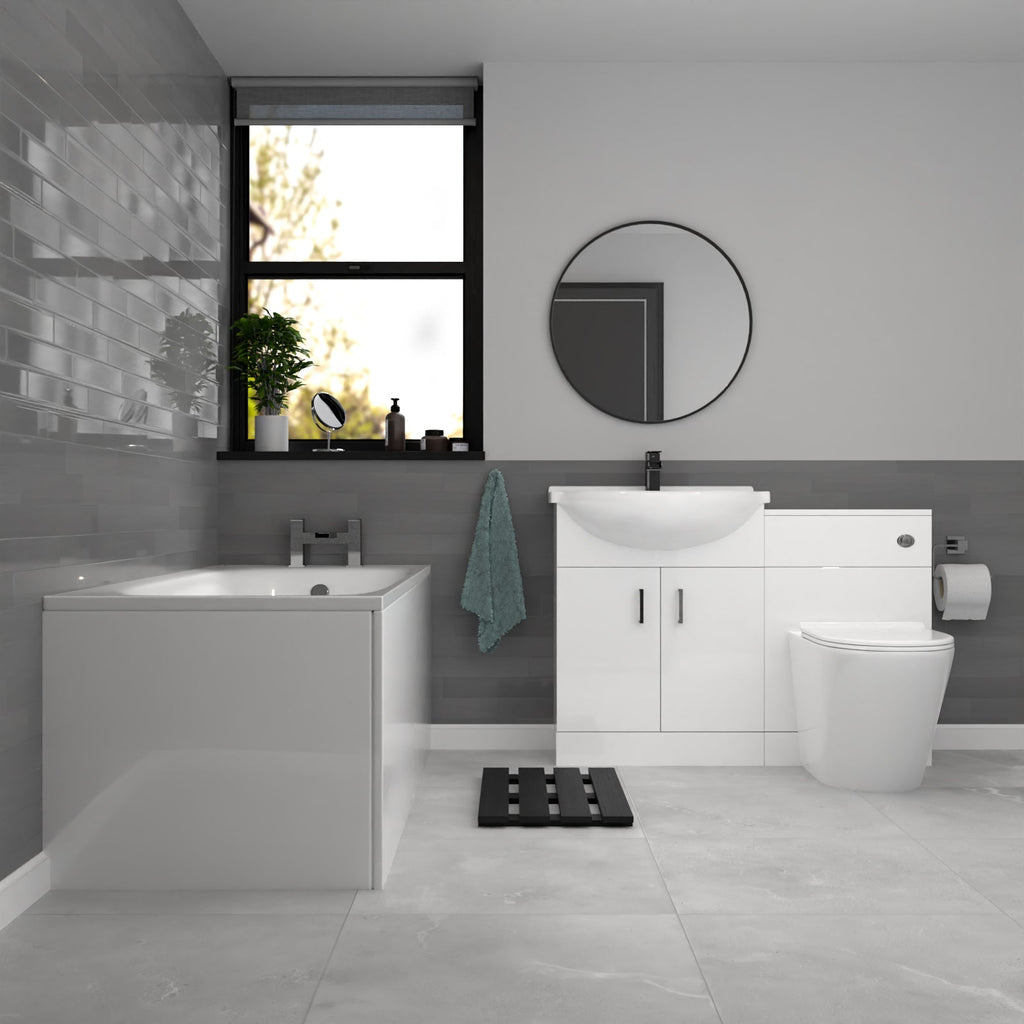 The White Vanity Unit With Basin, WC Unit, Round BTW Toilet & 1700mm Bath is a stylish and functional bathroom furniture set including a sleek gloss white vanity that stands on the floor, providing ample space for washing and storage. The WC unit is designed to conceal the cistern and plumbing, creating a neat and cohesive look. Together with the back to wall toilet, these furniture combinations create a modern and practical bathroom that enhances both aesthetics and functionality.