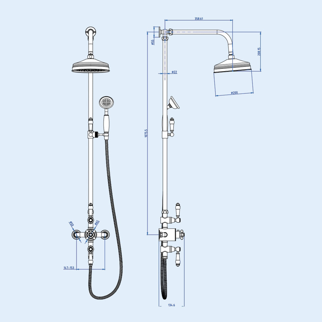 The solid brass riser rail comes with a 200mm brass shower head and an adjustable bracket for the handheld shower so you can move the shower headset up and down to suit your height. The shower kit comes with a complete traditional exposed valve with 3 main functions. The valve comes with two ceramic levers - the top controls the water flow and the water on/off for the main showerhead and the bottom controls the water flow and water on/off for the handheld shower allowing you to use both outlets at the same time. The cross handles in the middle of the valve provides ease of use and allows you to control the temperature.