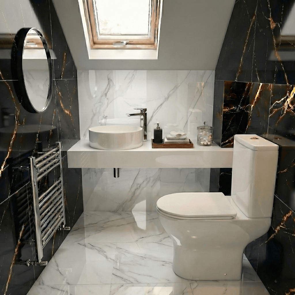 The perfect combination of style, space-saving design, and everyday practicality for small bathrooms and cloakrooms. This bundle pairs the sleek Etive 410 mm cloakroom round stand-alone counter top basin, designed to maximise available space with its modern silhouette, with the Theo contemporary round rimless close-coupled toilet featuring a soft-close seat and dual flush system. Each component is crafted for modern interiors, offering effortless hygiene, comfortable use, and coordinated contemporary styling, all in a set that enhances compact bathroom spaces.