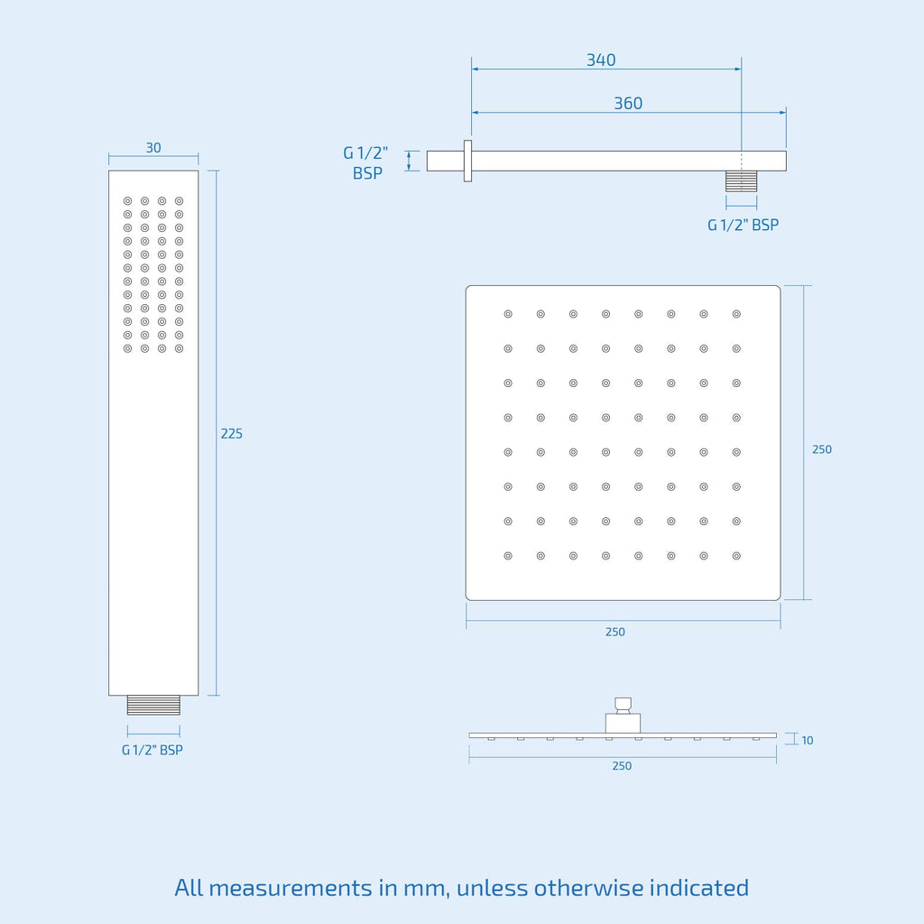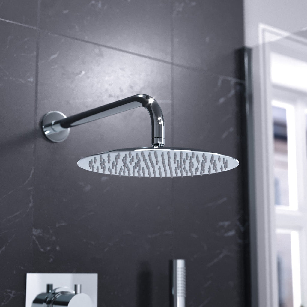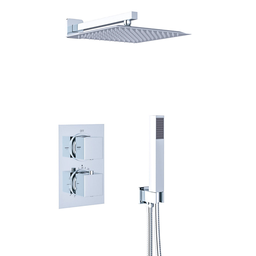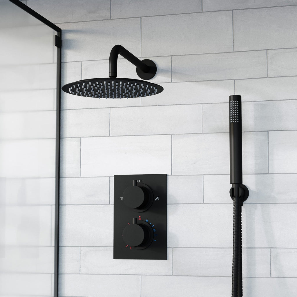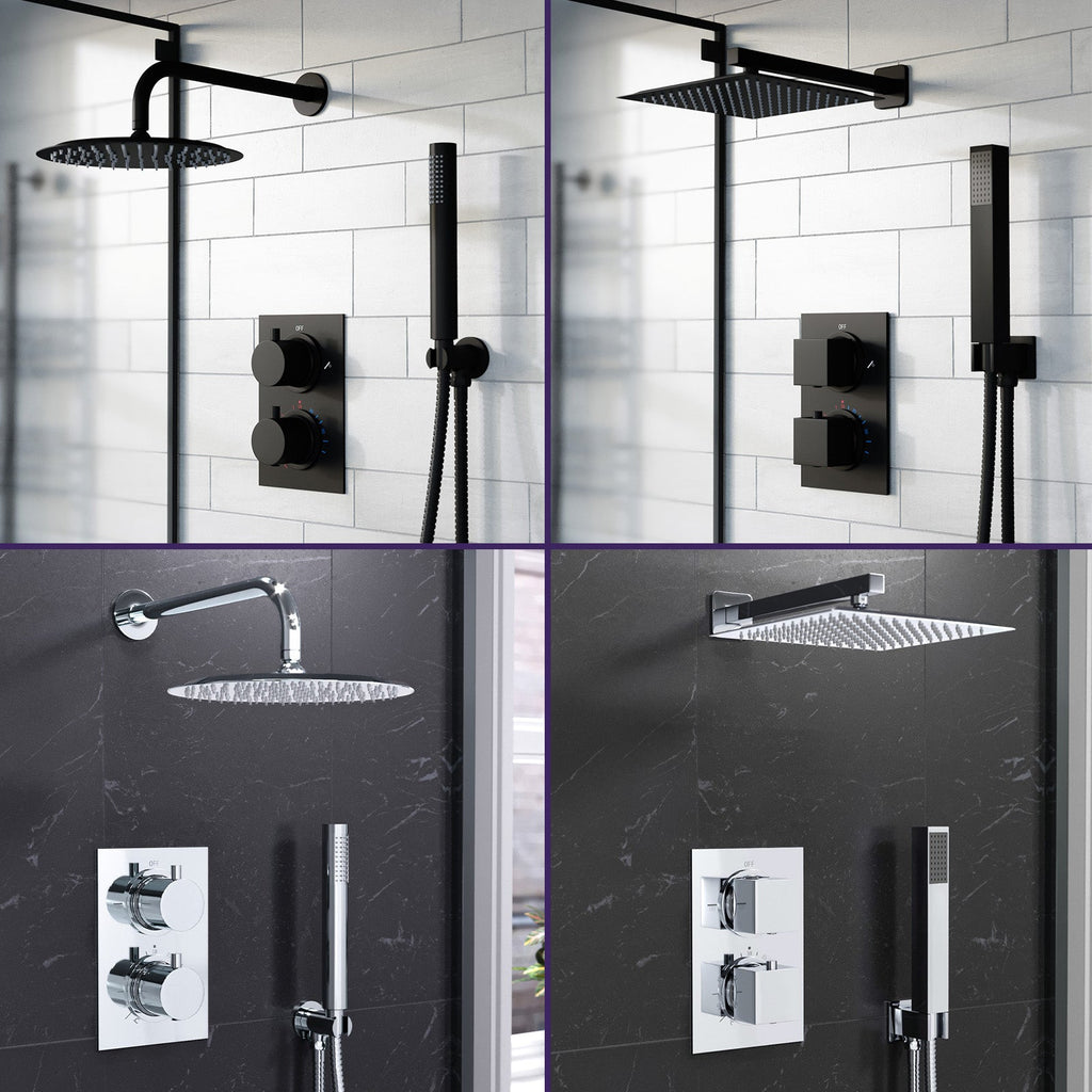 Experience a secure and enjoyable shower with our Concealed Chrome or Black Thermostatic Shower and handset. This advanced thermostatic shower system guarantees the perfect water temperature each time, providing you with a safe temperature and invigorating shower experience like no other. This is achieved through the use of thermostatic valves that effectively control the temperature. By incorporating added features such as the 38°C button, which prevents the water from becoming too hot, this shower system ensures a safe and comfortable shower experience. The minimal design elevates your bathrooms aesthetics and with its sturdy construction and dependable performance, ensuring years of luxurious showers. The durable high quality brass valves resist rust and corrosion ensuring consistent flow rate. Upgrade your bathroom today and indulge in the ultimate shower experience.