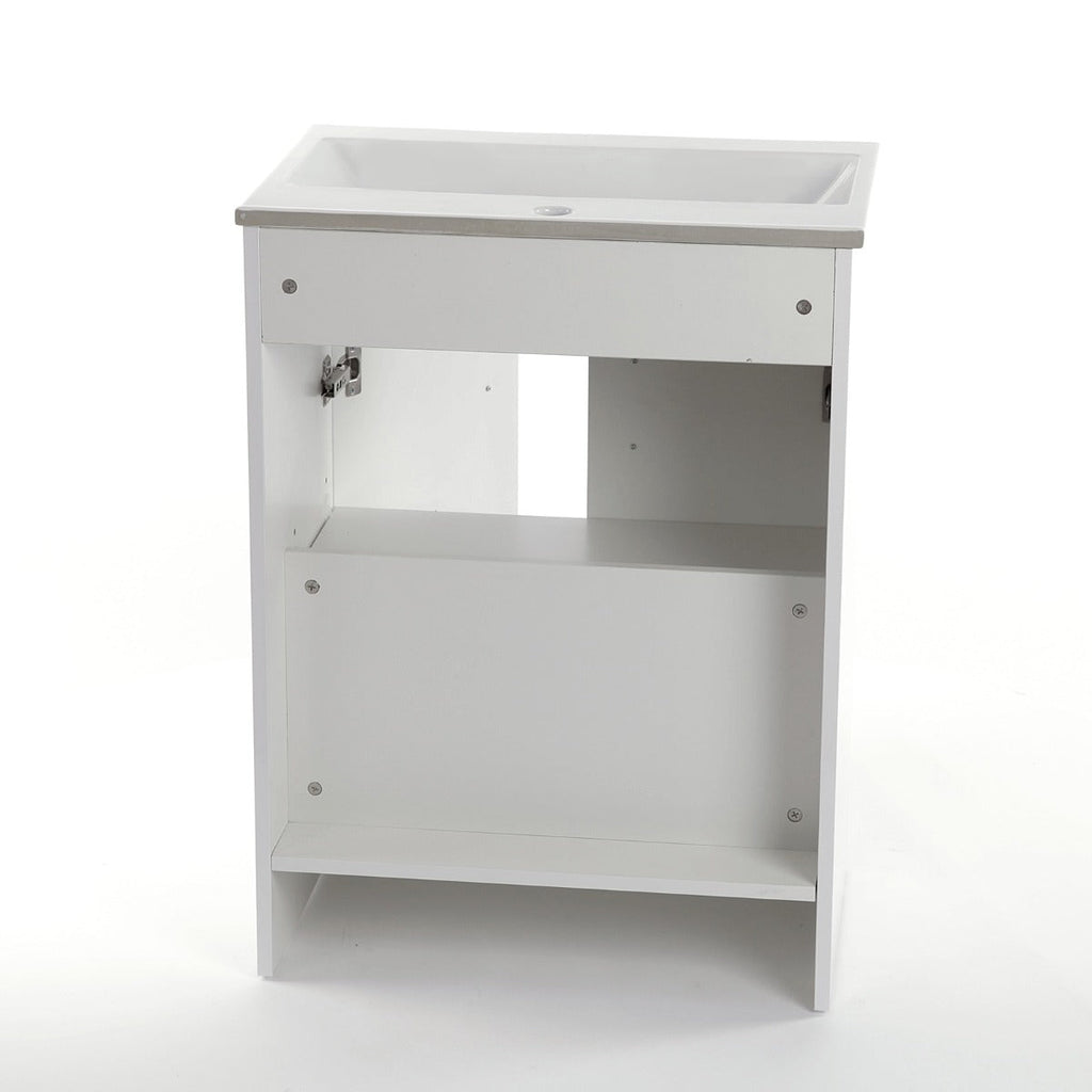 A minimalist 610mm wide floor standing vanity unit with quality stylish mid edged ceramic basin top, soft close doors and internal shelving - Make the most of your bathroom with our practical and attractive modern white gloss furniture options.