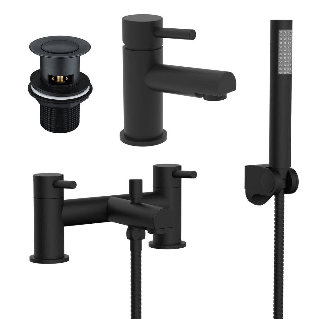 Our Shower Mixer Tap, Handheld Shower Kit & Basin Single Lever Mixer Tap are the perfect complement to any modern bathroom. It comes with a basin waste. The twin lever design of the bath filler allows for precise temperature and water flow control, ensuring a comfortable bathing experience. Both taps are constructed from high-quality brass material that is built to last. The stunning matt black finish creates a stylish look to your bathroom. Featuring tarnish and corrosion resistance, it gives you peace of mind for daily maintenance. This shower mixer tap and handheld kit provides a luxurious and versatile bathing experience for contemporary bathrooms