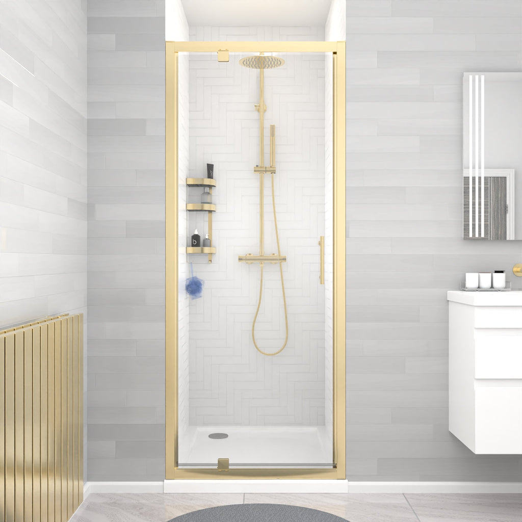 This pivot shower door with a brushed brass finish comes as a glass panel screen that can be placed in the corner of your bathroom. The brushed brass finish will compliment contrasting light or dark coloured interiors and gives a modern look to the corner of your bath or shower room. The best feature is the functionality of the reversable pivot door which can be installed to open from right to left or left to right depending on what suits you! Matching taps and mirrors are also available.