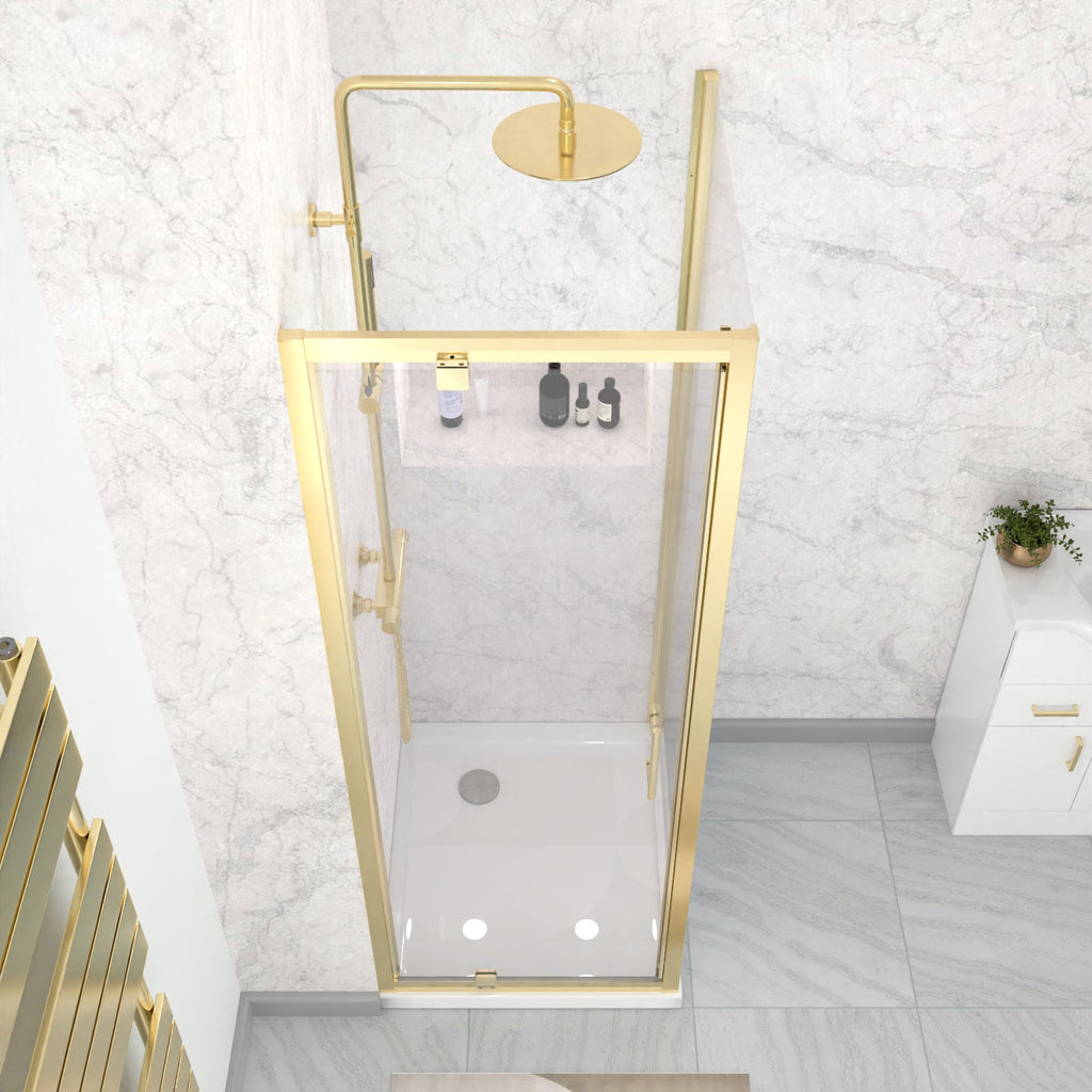This pivot shower door enclosure with a brushed brass finish comes as a glass panel screen that can be placed as an L-shaped cubicle in the corner of your bathroom. The brushed brass finish will compliment contrasting light or dark coloured interiors and gives a modern look to the corner of your bath or shower room. The best feature is the functionality of the reversable pivot door which can be installed to open from right to left or left to right depending on what suits you! Matching taps and mirrors are also available.