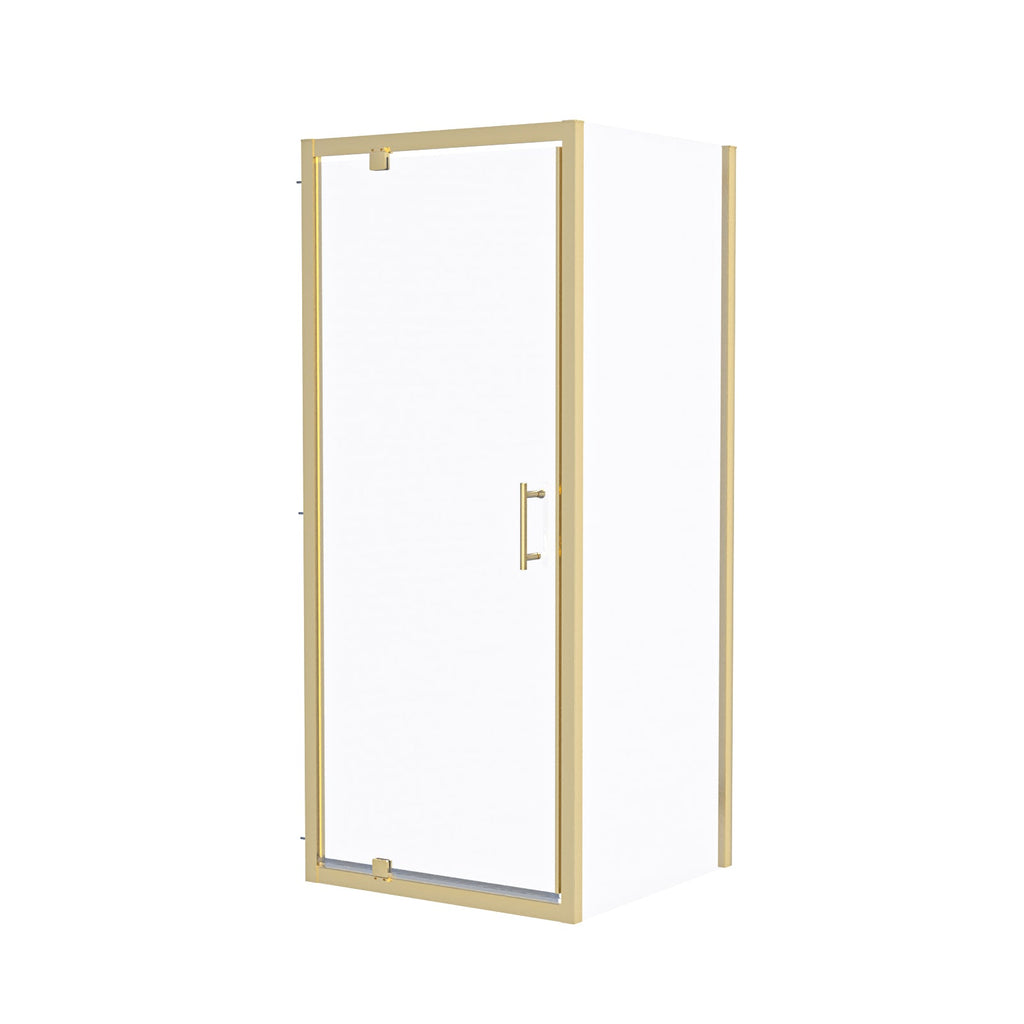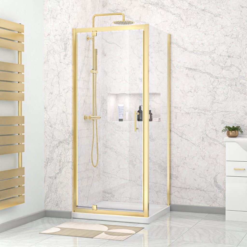 This pivot shower door enclosure with a brushed brass finish comes as a glass panel screen that can be placed as an L-shaped cubicle in the corner of your bathroom. The black finish will compliment contrasting light or dark coloured interiors and gives a modern look to the corner of your bath or shower room. The best feature is the functionality of the reversable pivot door which can be installed to open from right to left or left to right depending on what suits you! Matching taps and mirrors are also available.