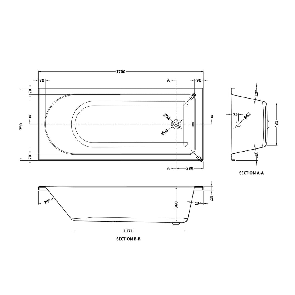 - 170 Litres Tap mounting - End of bath (above overflow)