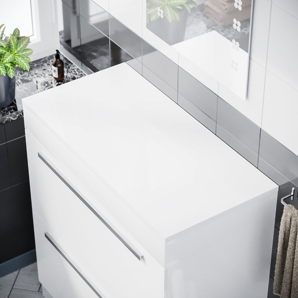 Elevate your bathroom with our stylish vanity worktop. Whether to replace your old one or you simply want a fresh and functional upgrade, this worktop is the perfect choice. Crafted from 100% moisture-resistant MDF, this sleek worktop is built for daily use. The stylish design seamlessly complements modern vanity units, providing a sturdy, spacious surface to display your bathroom essentials. Transform your bathroom and have this vanity worktop in your next renovation project.