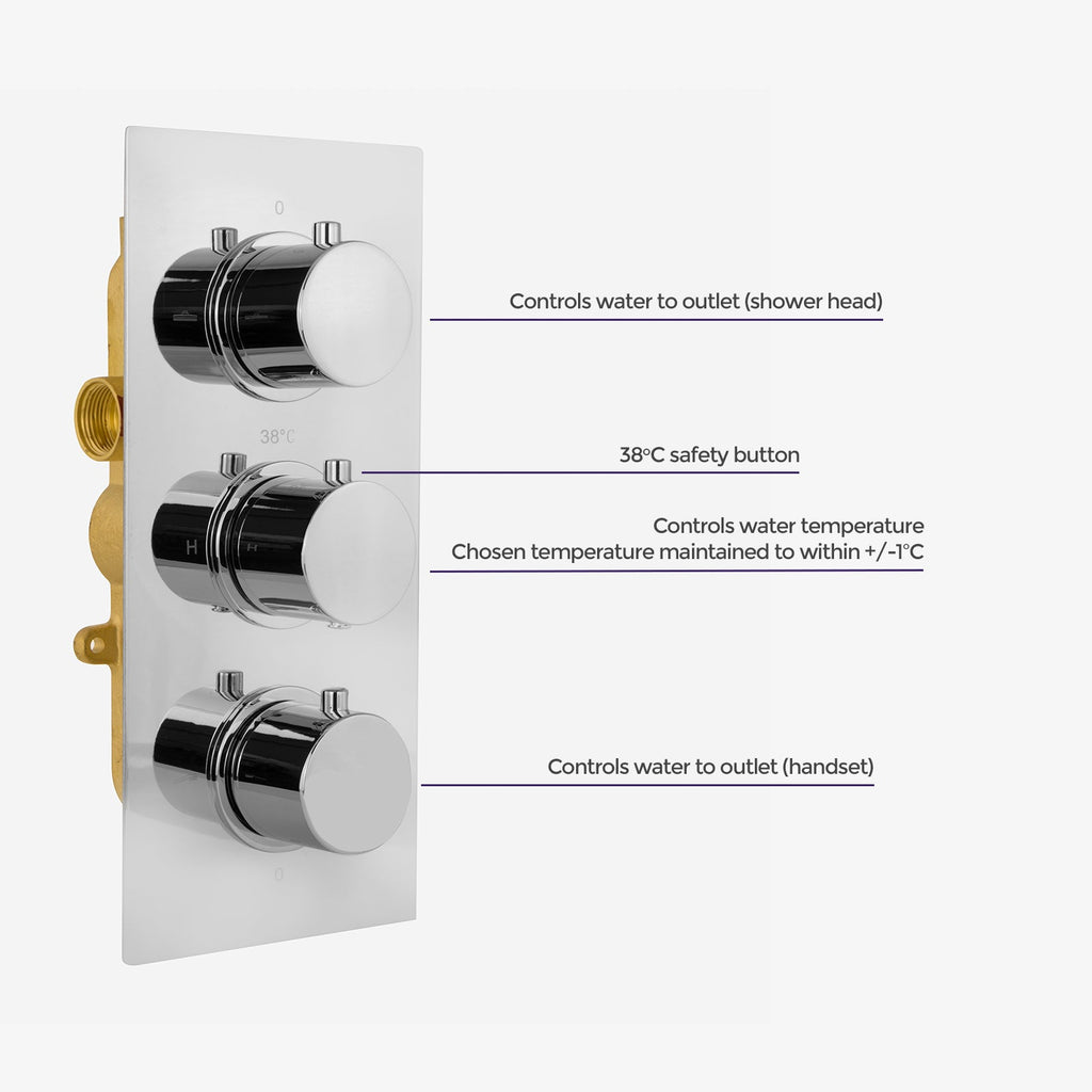 This concealed shower set will upgrade any bathroom, offering a thermostatic control to consistently control the temperature of your water. Featuring a contemporary overhead shower head with a swivel joint & arm, three dial, 2 outlet valve a round shower handset this bathroom set will look great.