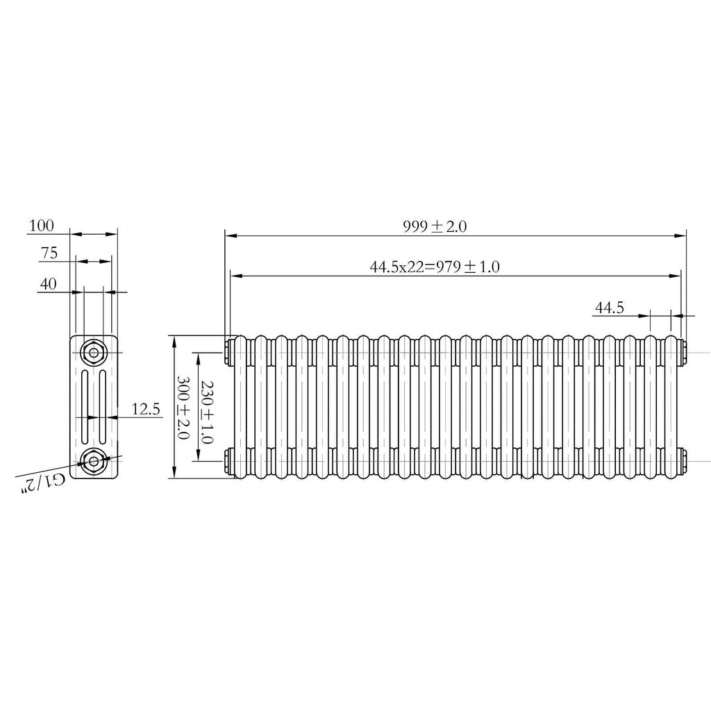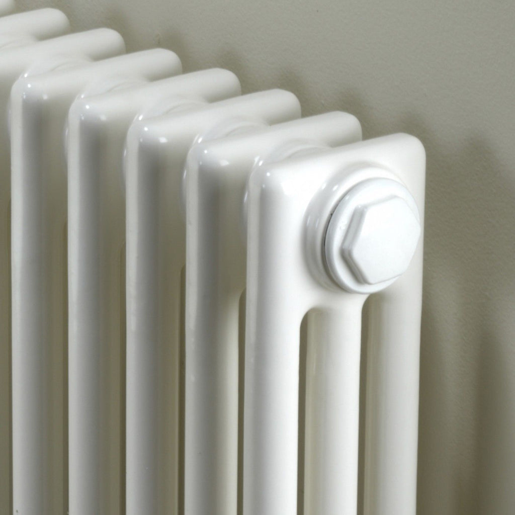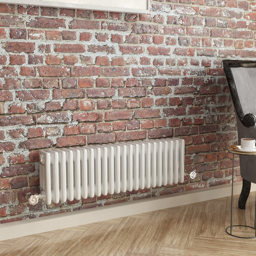 This white horizontal radiator (300 x 999 mm) features a classic triple column colosseum design for high heat output and elegant style. Ideal for bedrooms, kitchens, TV lounges, and living rooms, it delivers efficient warmth and blends seamlessly with traditional or modern interiors.