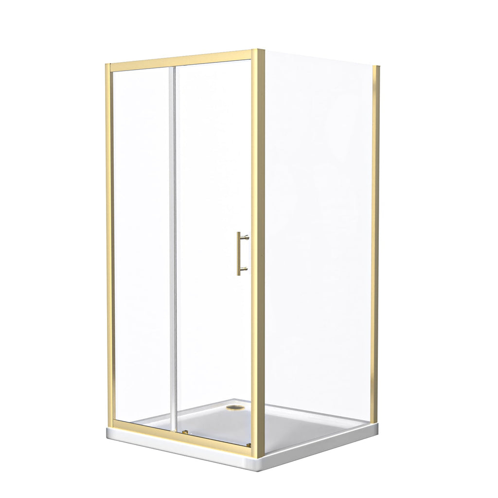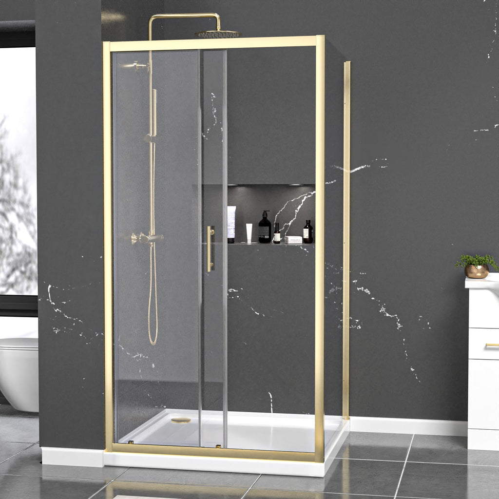 This shower enclosure has a tempered glass sliding door and comes in a brushed brass finish. This enclosure can be created by placing the sliding door and side panel as an L-shape cubicle in the corner of your bathroom. The brushed brass finish will compliment contrasting light or dark coloured interiors and gives a modern look to the corner of your bath or shower room. Matching taps and mirrors are also available. The sliding door is particularly useful as it will help you to save space by not opening out into the room. Additionally, the glass panels on the shower enclosure are created from 6 mm premium tempered clear glass. For easy installation of the sliding door, the aluminium frame allows for a 40 mm wall adjustment for when the walls are slightly out.