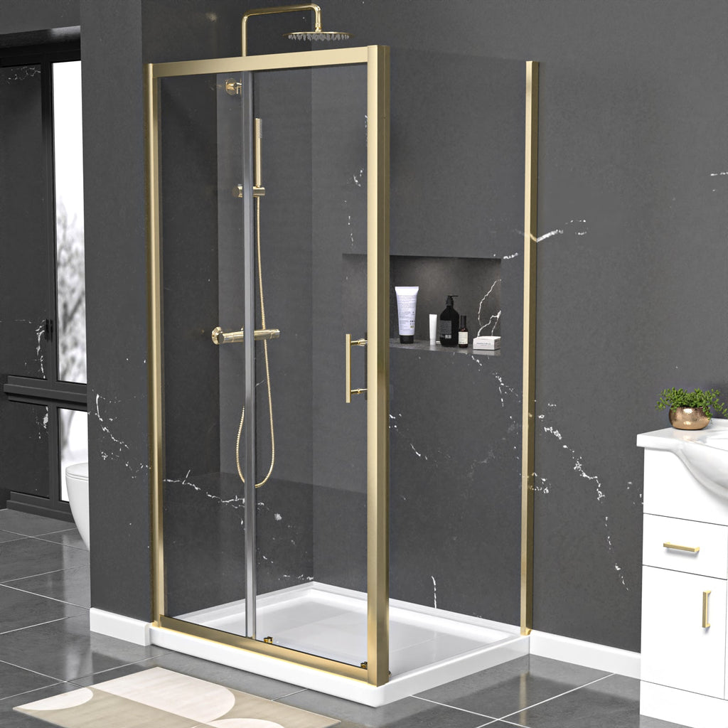 This shower enclosure has a tempered glass sliding door and comes in a brushed brass finish. This enclosure can be created by placing the sliding door and side panel as an L-shape cubicle in the corner of your bathroom. The brushed brass finish will compliment contrasting light or dark coloured interiors and gives a modern look to the corner of your bath or shower room. Matching taps and mirrors are also available. The sliding door is particularly useful as it will help you to save space by not opening out into the room. Additionally, the glass panels on the shower enclosure are created from 6 mm premium tempered clear glass. For easy installation of the sliding door, the aluminium frame allows for a 40 mm wall adjustment for when the walls are slightly out.