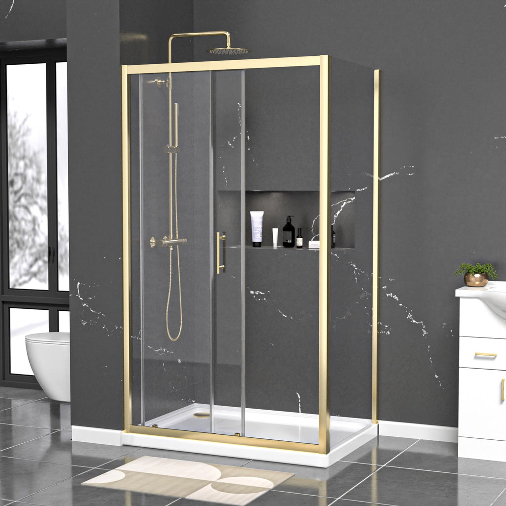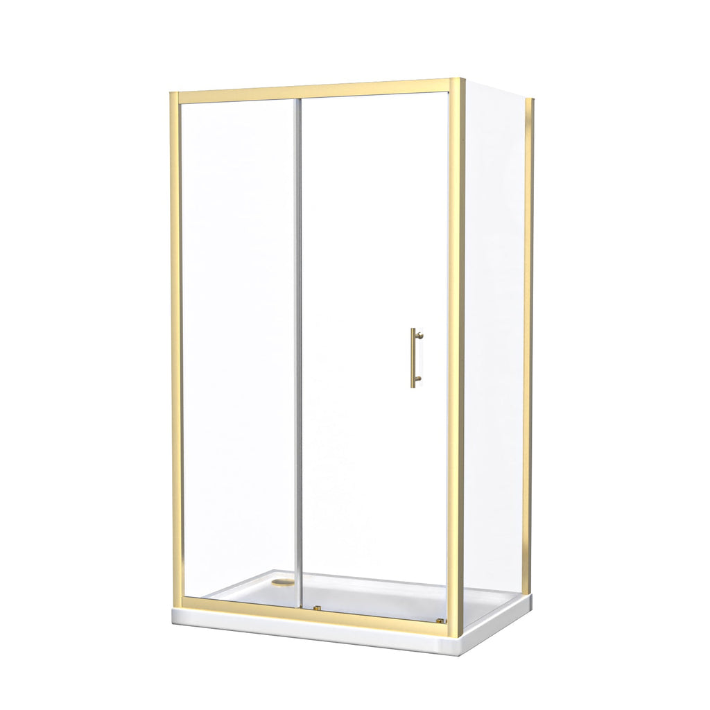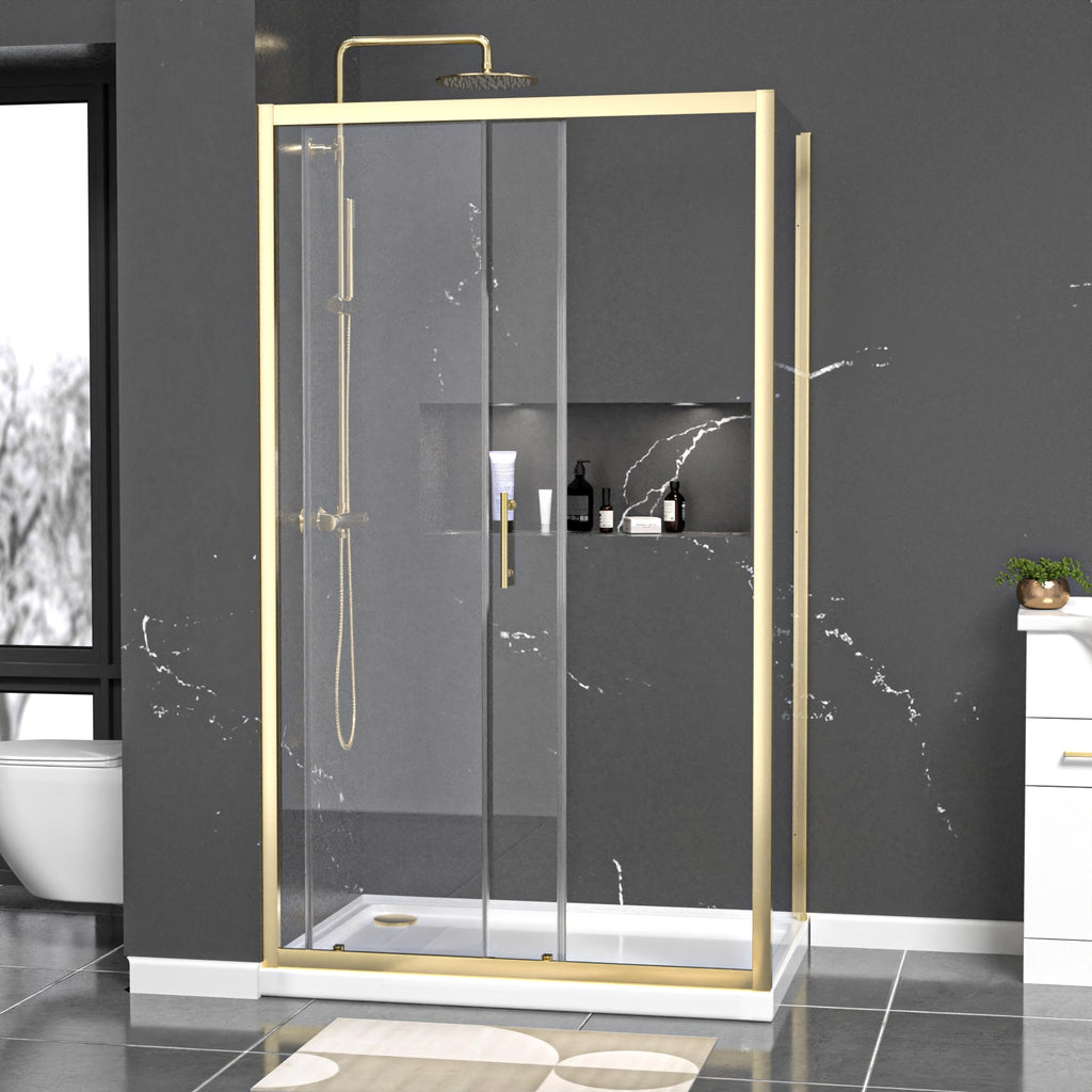This shower enclosure has a tempered glass sliding door and comes in a brushed brass finish. This enclosure can be created by placing the sliding door and side panel as an L-shape cubicle in the corner of your bathroom. The brushed brass finish will compliment contrasting light or dark coloured interiors and gives a modern look to the corner of your bath or shower room. Matching taps and mirrors are also available. The sliding door is particularly useful as it will help you to save space by not opening out into the room. Additionally, the glass panels on the shower enclosure are created from 6 mm premium tempered clear glass. For easy installation of the sliding door, the aluminium frame allows for a 40 mm wall adjustment for when the walls are slightly out.