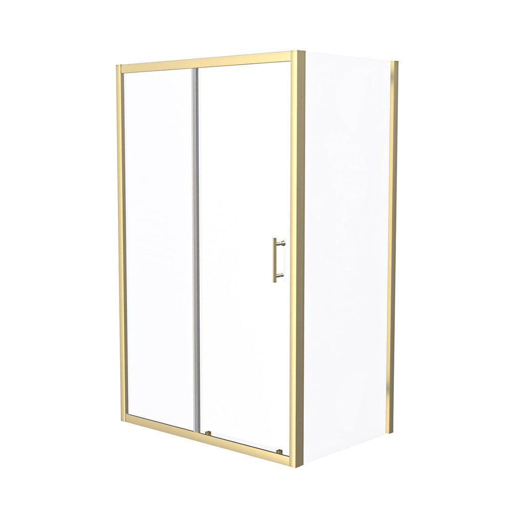 This shower enclosure has a tempered glass sliding door and comes in a brushed brass finish. This enclosure can be created by placing the sliding door and side panel as an L-shape cubicle in the corner of your bathroom. The brushed brass finish will compliment contrasting light or dark coloured interiors and gives a modern look to the corner of your bath or shower room. Matching taps and mirrors are also available. The sliding door is particularly useful as it will help you to save space by not opening out into the room. Additionally, the glass panels on the shower enclosure are created from 6 mm premium tempered clear glass. For easy installation of the sliding door, the aluminium frame allows for a 40 mm wall adjustment for when the walls are slightly out.