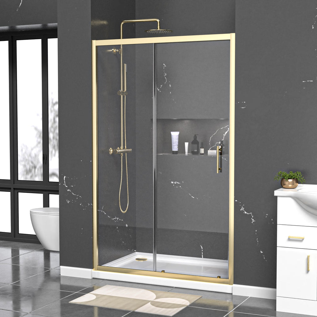 This shower enclosure glass sliding door comes in a brushed brass finish which gives a modern look to your bath or shower room. The sliding door is made from 6mm premium tempered glass with smooth operation. It is particularly useful as it will help you to save space by not opening out into the room. For easy installation of the sliding door, the aluminium frame allows for a 40 mm wall adjustment for when the walls are slightly out.