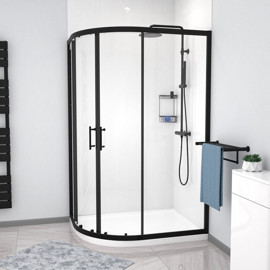 This quadrant shower enclosure in a matt black finish comes with 6mm tempered glass which is specifically easy-clean-glass. The shower doors with a smooth, sliding mechanism and shower door handles gives this shower an elegant feel. It’s not a problem if your walls are slightly positioned at the wrong angle as this enclosure adjusts by 20mm. The shower enclosure also comes with a low profile shower tray and a removable waste. The finish will compliment contrasting light or dark coloured interiors and gives a modern look to the corner of your bath or shower room. Matching, taps and mirrors are also available.