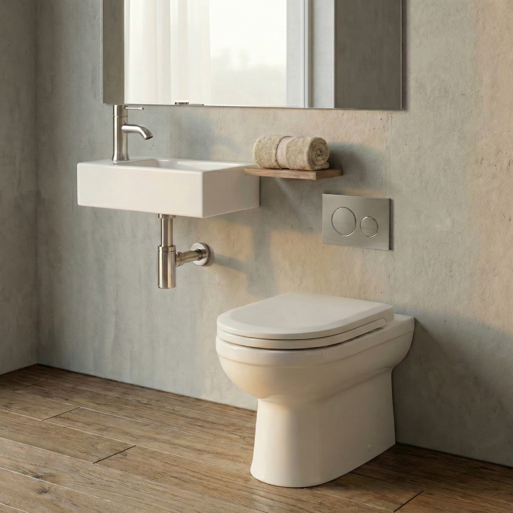 The Melbourne back to wall pan and seat is an ultra modern designer shape. The clean cut lines and gentle curved edges work in harmony together to blend into any type of bathroom suite. The toilet pan and seat will compliment bath or shower, creating a stunning complete modern bathroom, cloakroom or en-suite. This toilet pan and seat can be used for domestic and commercial use. In this mega package of ours we have the white ceramic wall hung cloakroom corner basin one tap hole sink which is practical and stylish, and easy to use. Cloakroom basins are great for creating more room in your bathroom and making it look more spacious. As well as making your bathroom look more contemporary and neat.