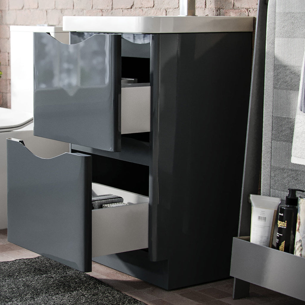 - Luxurious grey gloss finish, perfect for contemporary bathrooms with sleek curved edges