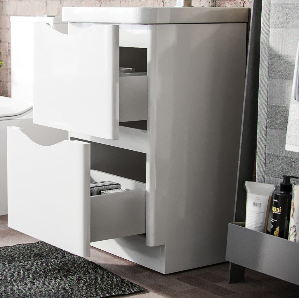 - Luxurious grey gloss finish, perfect for contemporary bathrooms with sleek curved edges