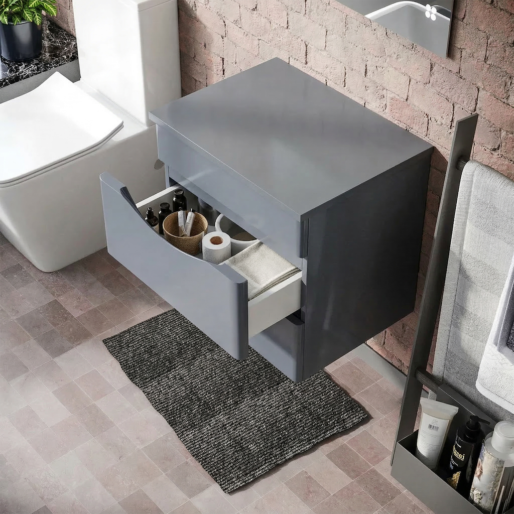 Create a sleek and modern floating vanity setup with this coordinated combination of the Merton 500mm wall-hung vanity cabinet and the gloss grey worktop. The wall-mounted cabinet features two soft-close drawers with a handleless, concealed design, providing practical storage while maintaining a clean, minimalist aesthetic. Paired with the matching worktop, this set is ideal for countertop basin installations, providing a stylish and functional solution for contemporary bathrooms, en-suites, and cloakrooms. Built from moisture-resistant materials, both components are designed for durability, everyday use, and modern bathroom styling.