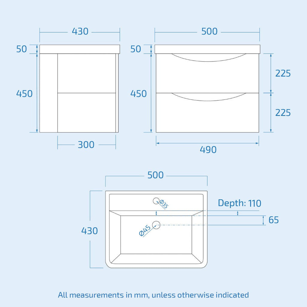 - Total Unit Width: 500mm