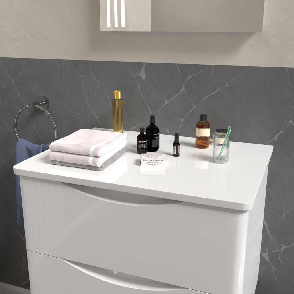 Elevate your bathroom with our stylish vanity worktop. Whether to replace your old one or you simply want a fresh and functional upgrade, this worktop is the perfect choice. Crafted from 100% moisture-resistant MDF, this sleek worktop with round corners is built for daily use. The stylish design seamlessly complements modern vanity units, providing a sturdy, spacious surface to display your bathroom essentials. Transform your bathroom and have this vanity worktop in your next renovation project.