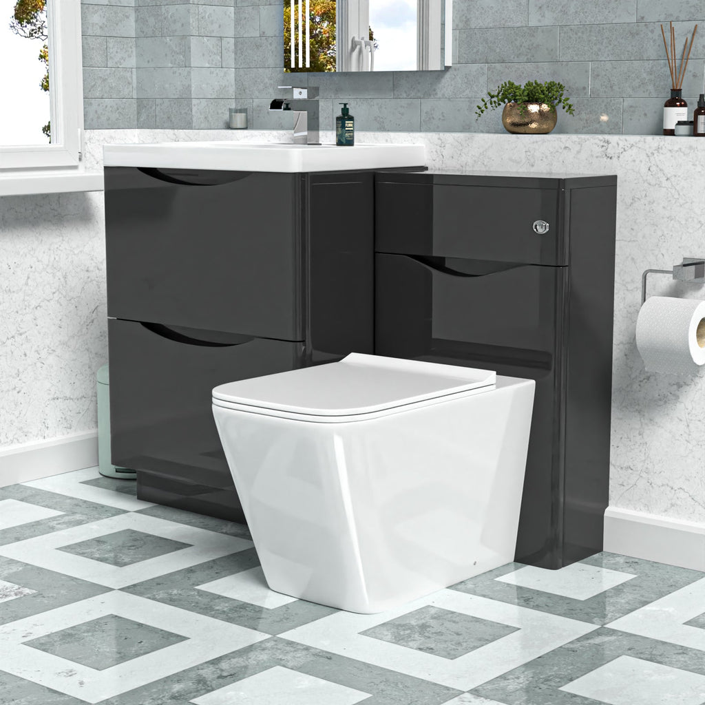 - High gloss glaze dark grey finish back-to-wall toilet with soft close seat