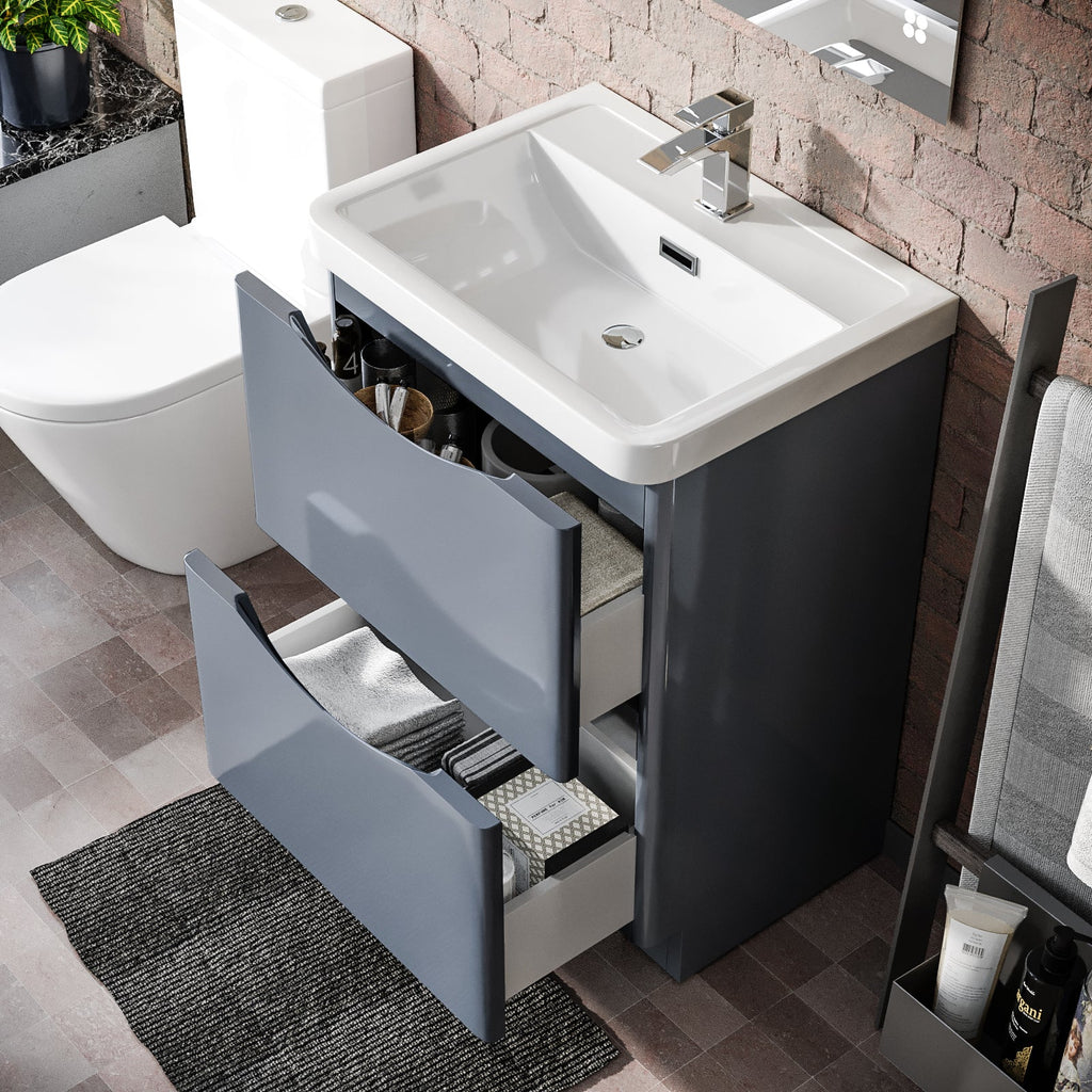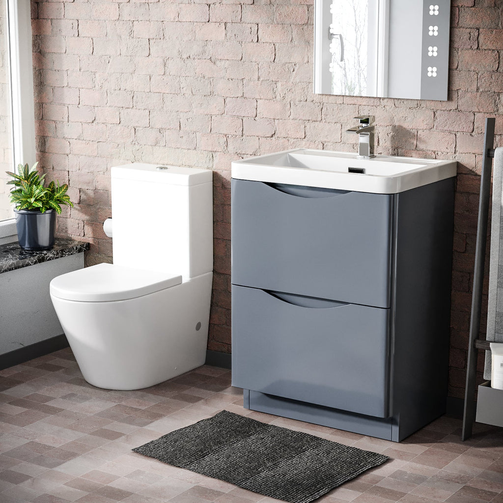This stunning 600 mm grey basin vanity unit comes complete with a rimless close-coupled toilet. Arriving pre-assembled and constructed from a moisture-resistant material and comes complete with a basin. Our floor standing basin vanity unit gives you the best of both worlds, combining incredible durability and a beautiful gloss finish.