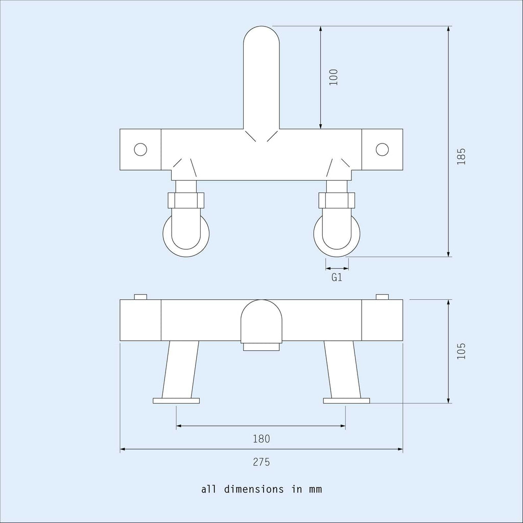 This stylish contemporary thermostatic bath shower mixer with bottom outlet and deck mounted legs, for best performance we recommend a minimum operating pressure of 1 bar for best performance. Combining both style and ease of control. Tap comes with a diverter to control function between tap and shower.