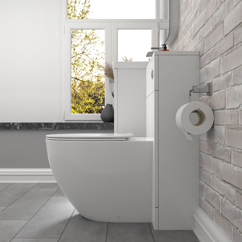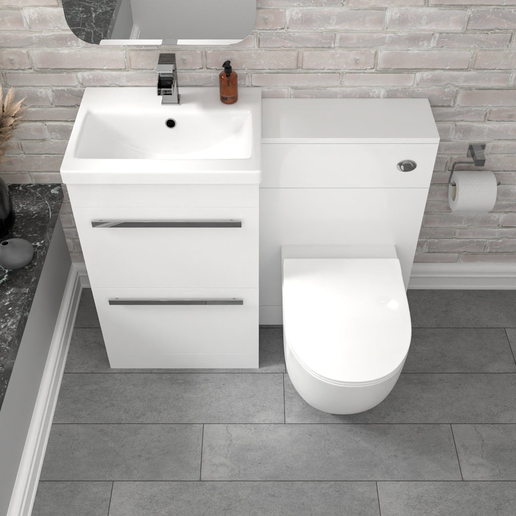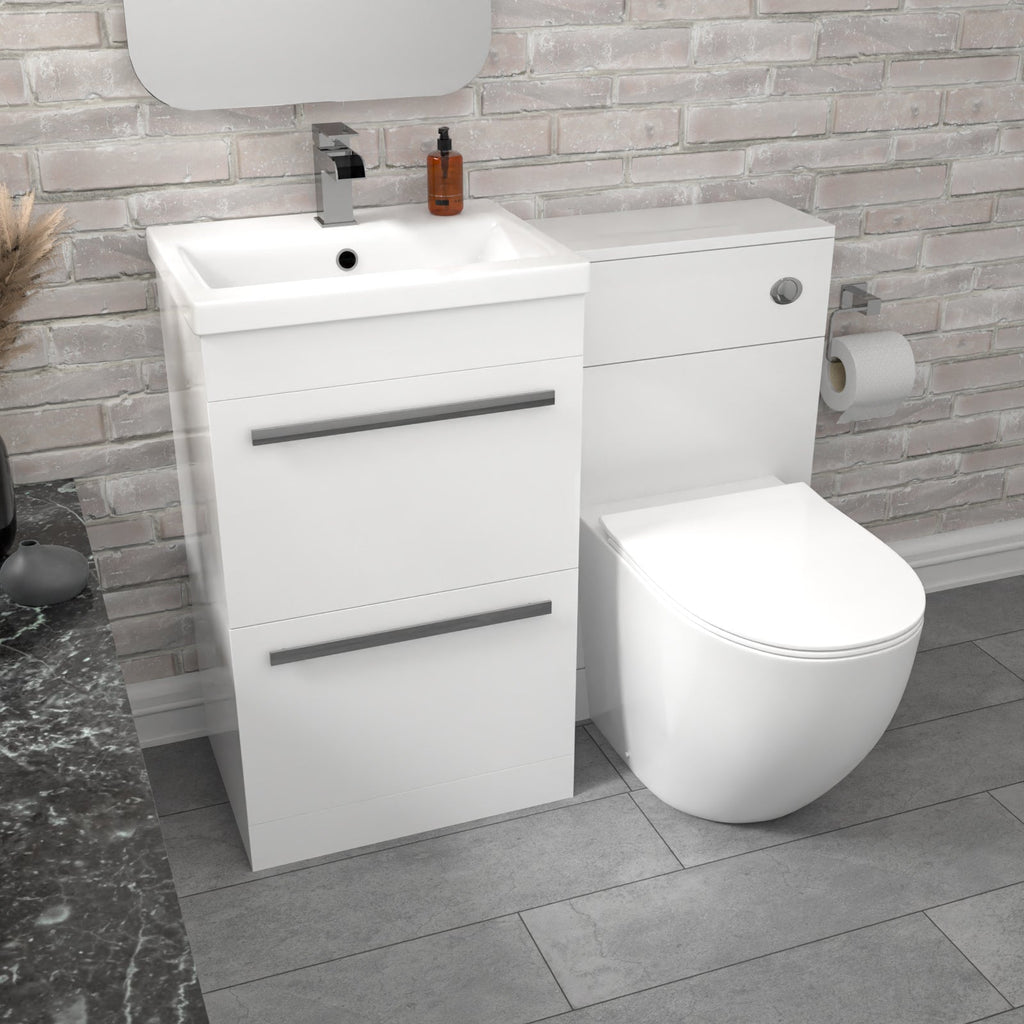 This beautiful 1000 mm white gloss freestanding basin vanity cabinet and WC Toilet comes complete with a high-quality basin. The back to wall toilet pan and seat is an ultra-modern designer shape, this toilet is made from white ceramic, covered with a high gloss finish which makes the toilet stand out.