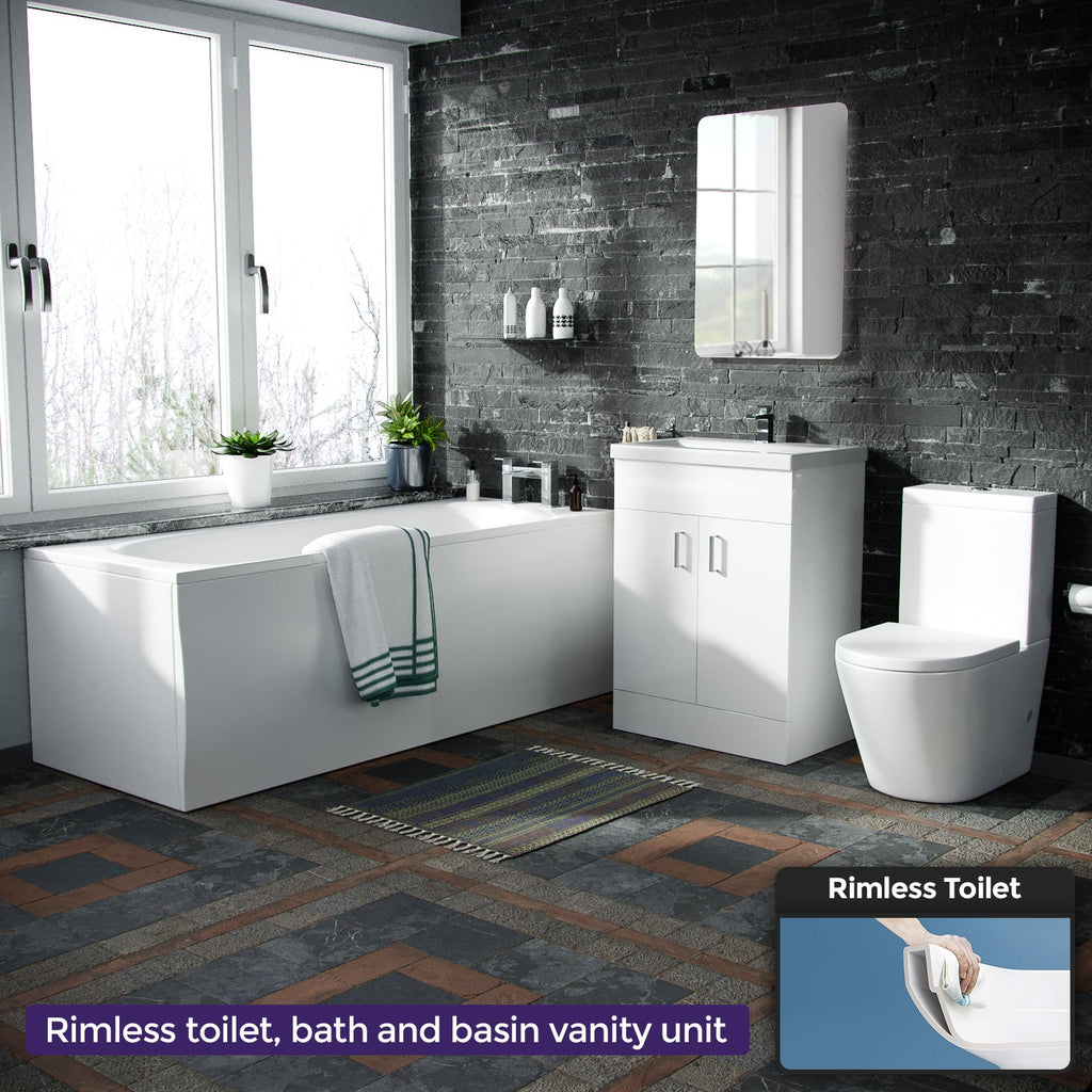 This unique bathroom suite features a stunning toilet, vanity basin unit and a straight edge bath is perfect for any size bathrooms.