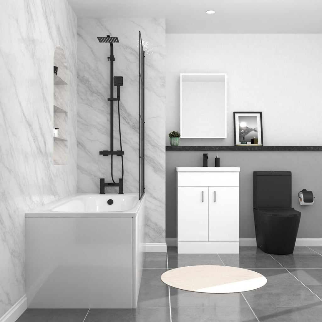 This Black Toilet Vanity Bathroom Suite includes a 1700mm straight edge bathtub with grid shower screen, a basin vanity unit, and close coupled Toilet, providing all essential elements for a complete bathroom suite. The generous size of the bath tub offers ample space for shower or bath with a stylish black grid shower screen. The bath filler tap and thermostatic shower mixer set give you a two way shower experience and meet your needs. The basin vanity unit and a black finish close coupled toilet provides a mix of functionality and aesthetic to your bathroom.