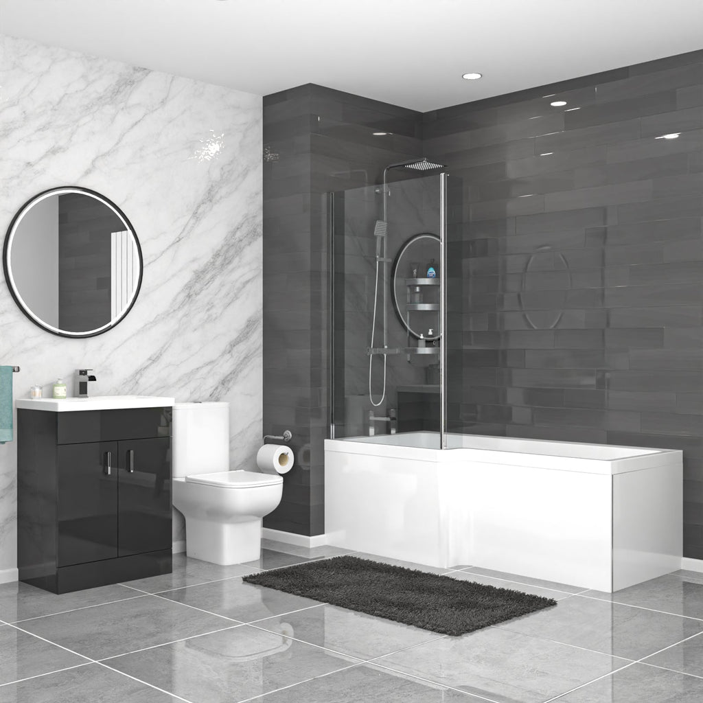 Upgrade your bathroom with our L-Shaped Left Handed Bath Set. It includes a 600mm Floor Standing White Basin Vanity with Taps and a Back-to-Wall Toilet for a seamless, modern look. The exposed shower adds a contemporary touch. Enjoy style and functionality in one complete package.