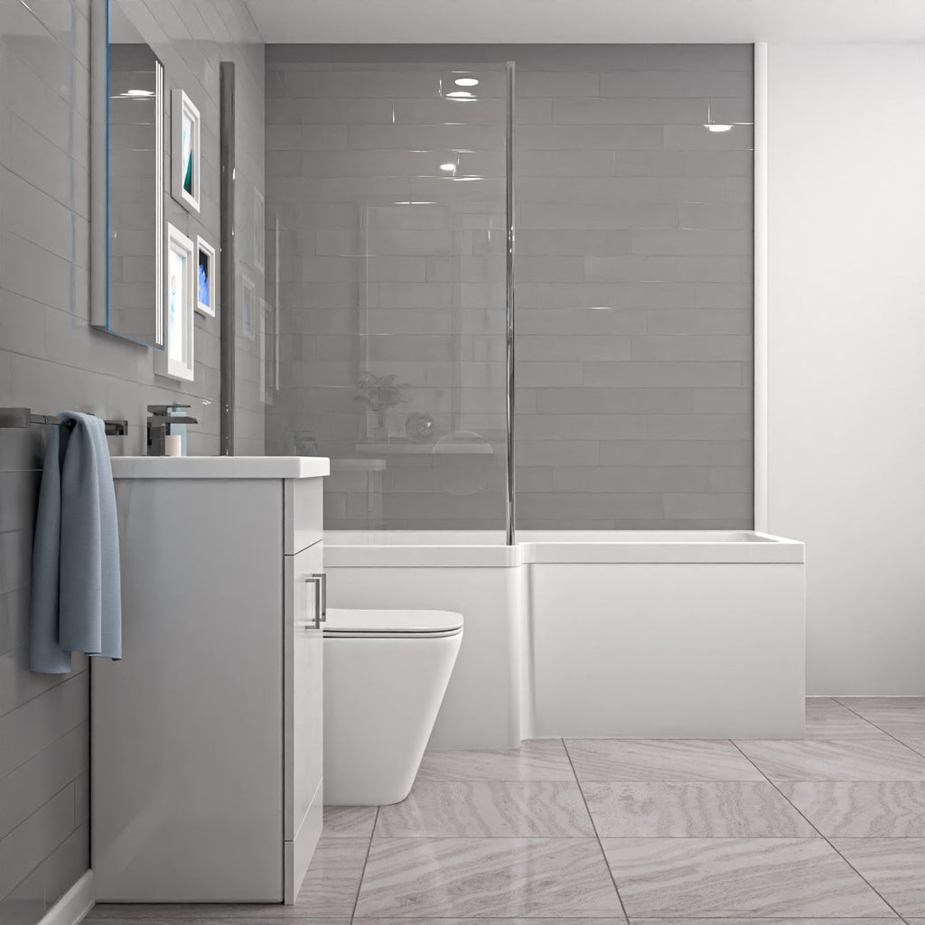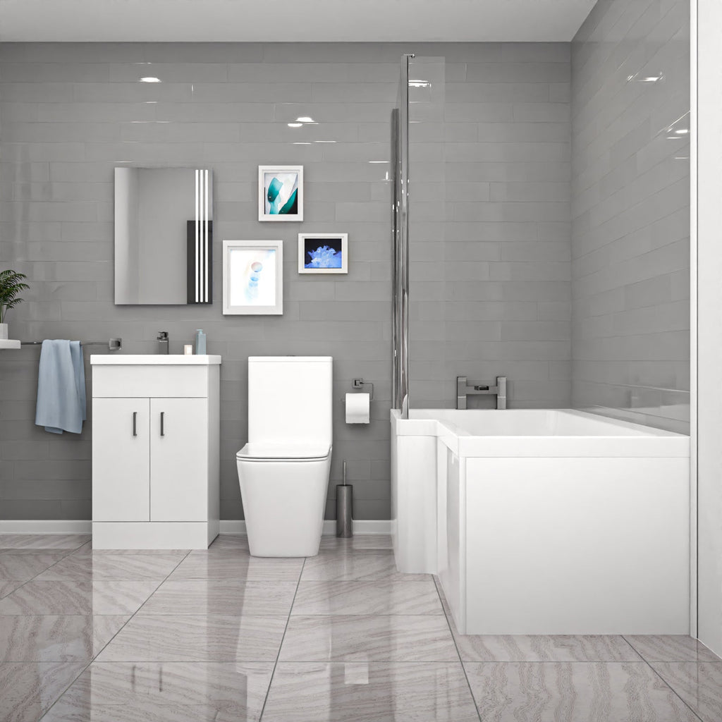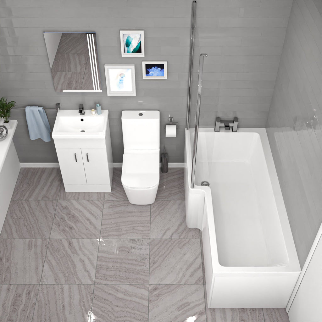 L-Shaped Bath with Bath Panels, Shower Screen, WC, Toilet, Thermostatic Shower, Basin & Bath Taps, Wastes & Vanity Unit featuring a choice of width between 600 mm or 500mm