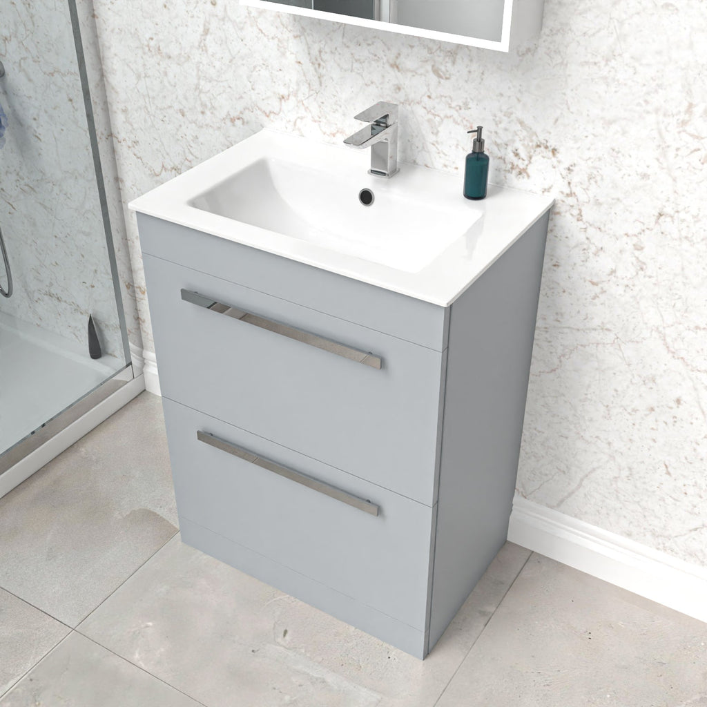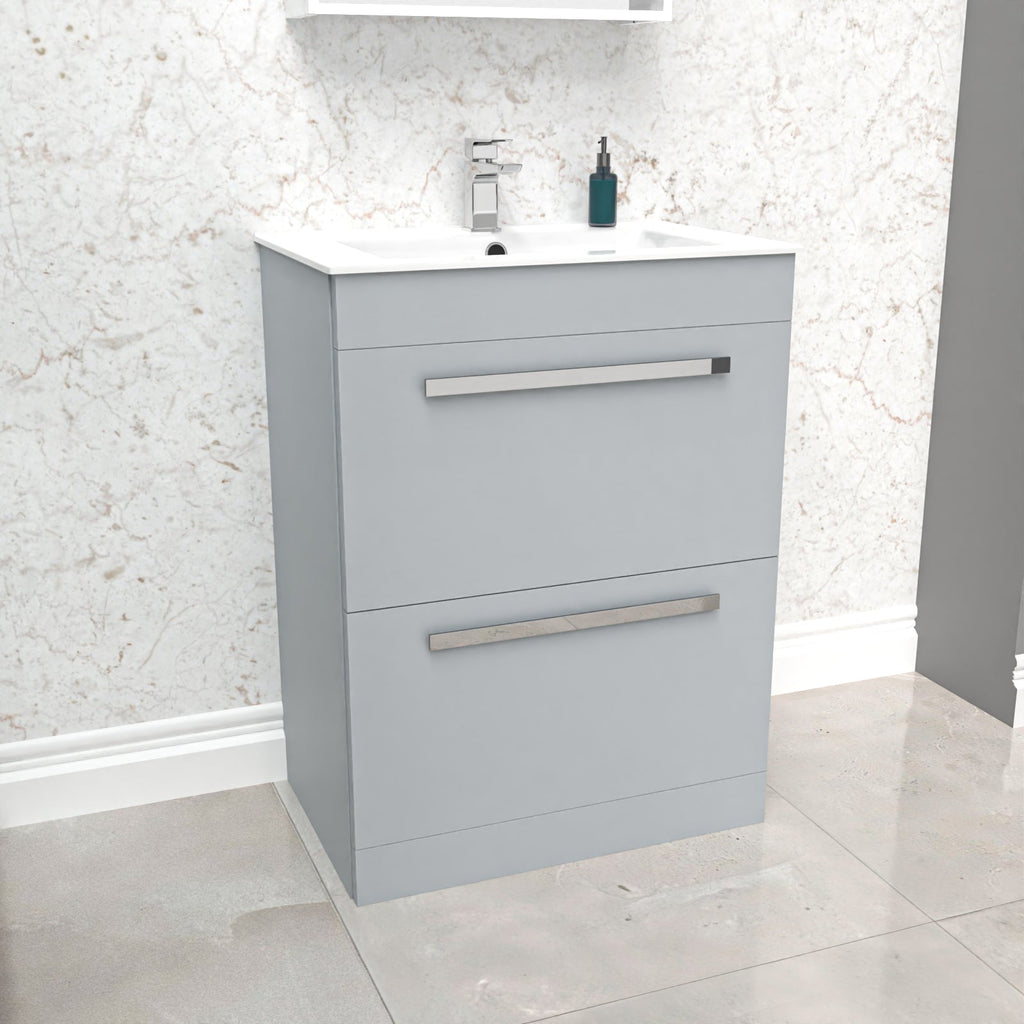 This beautiful 600MM Floor Standing 2 Drawer Vanity Unit comes complete with a high-quality basin, Our bathroom Drawer Cabinet & Sink Basin units are ideal for family bathrooms and add a touch of style to a practical space.