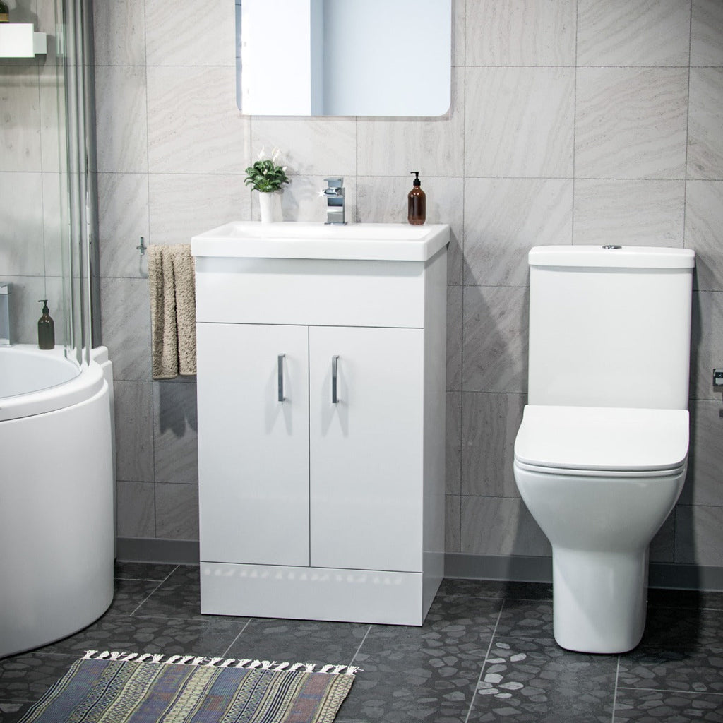 Strong square shapes fuse with subtle curves to make this rimless toilet fit perfectly within this contemporary bathroom suite. The beautiful white gloss freestanding basin vanity unit comes complete with high-quality basin. Engineered with everyday use in mind, providing a storage solution for your bathroom, our Basin Vanity Unit gives you the best of both worlds, combining incredible durability and a beautiful gloss finish.