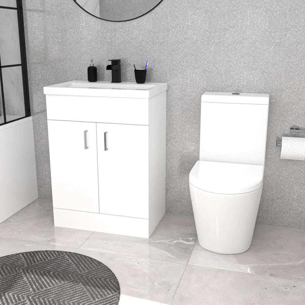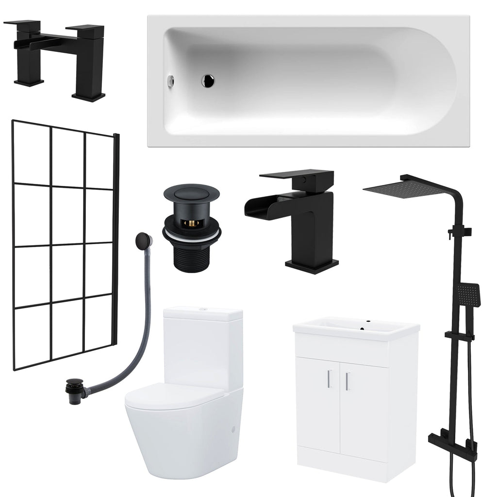 This Toilet Vanity Bathroom Suite includes a 1700mm straight edge bathtub with grid shower screen, a basin vanity unit, and close coupled Toilet, providing all essential elements for a complete bathroom suite. The generous size of the bath tub offers ample space for shower or bath with a stylish black grid shower screen. The bath filler tap and thermostatic shower mixer set give you a two way shower experience and meet your needs. The basin vanity unit and close coupled toilet provides a mix of functionality and aesthetic to your bathroom.