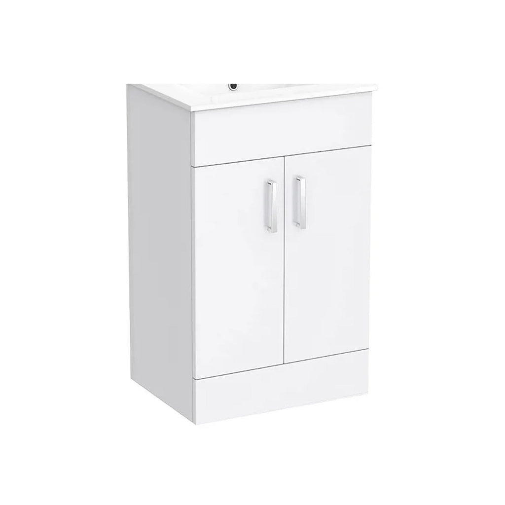 A sleek, floor-standing replacement vanity unit in gloss white, this vanity cabinet features two soft-closing doors with chrome handles for quiet, elegant operation. It arrives pre-assembled offering practical under-sink storage. Basin and tap fittings are not included.