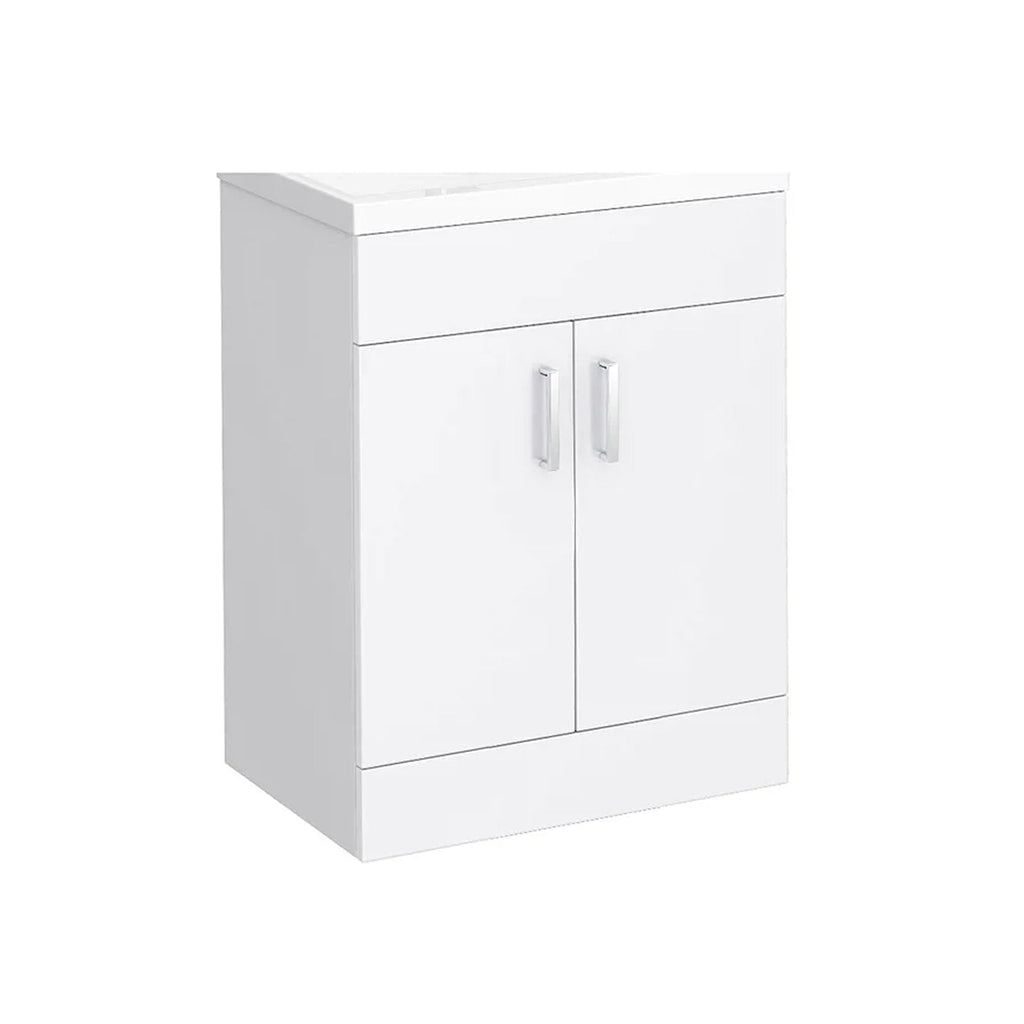 A sleek, floor-standing replacement vanity unit in gloss white, this vanity cabinet features two soft-closing doors with chrome handles for quiet, elegant operation. It arrives pre-assembled offering practical under-sink storage. Basin and tap fittings are not included.