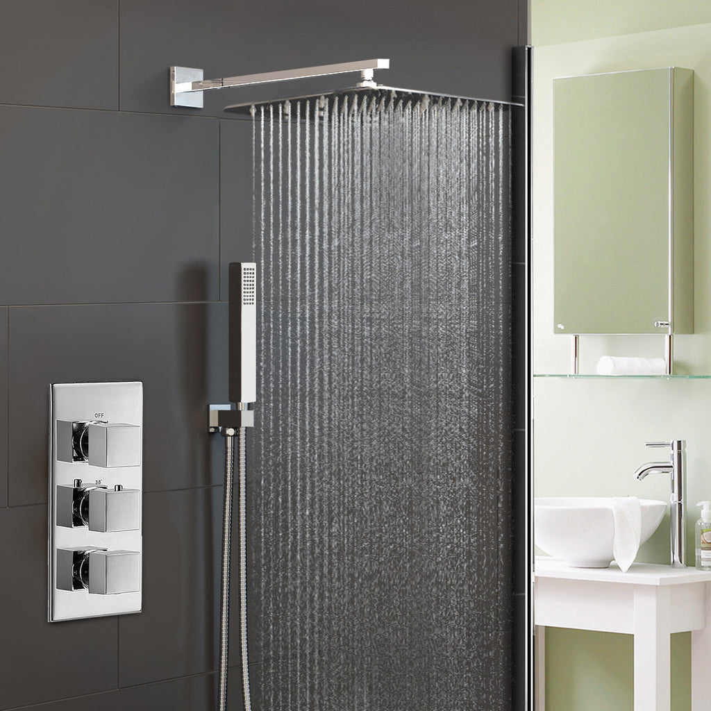 This Modern Design Concealed Thermostatic Valve will compliment any modern bathroom suite and offers thermostatic showering via two easy-to-operate controls for temperature and flow. It is supplied with a 300mm stainless steel slim shower head, swivel joint and arm, handheld shower, and bath filler with click-push button waste.