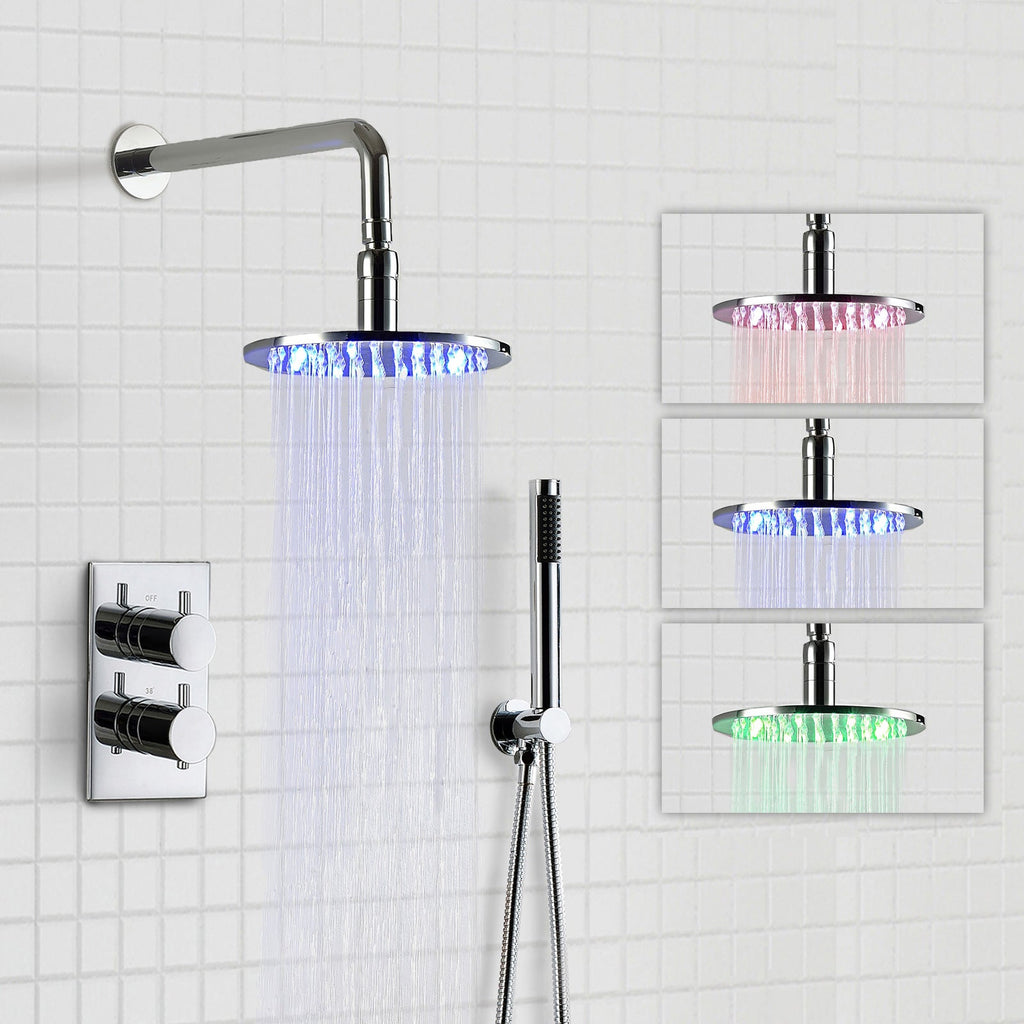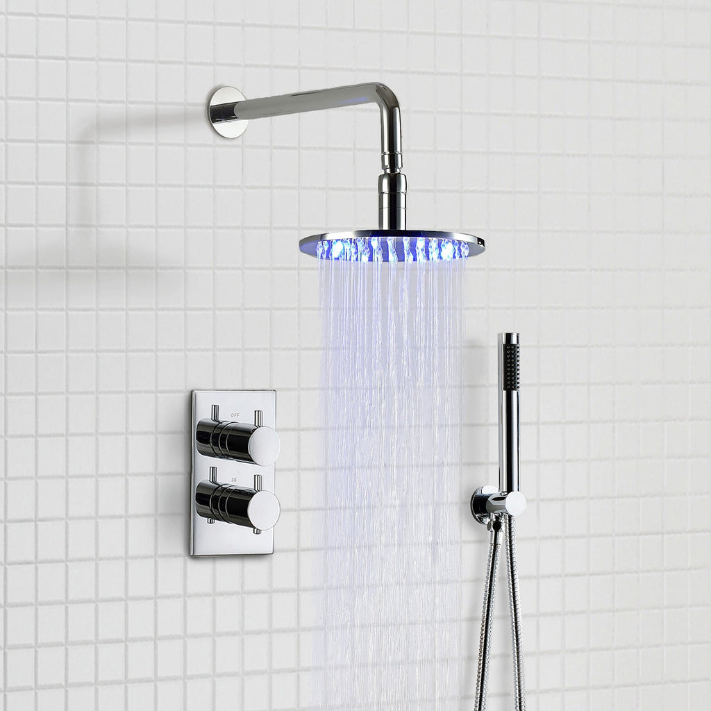 Enhance your bathroom with a beautiful complete 2 dial 3 way concealed thermostatic shower set featuring an LED Light shower head & shower handset for ultimate shower versatility. Experience a secure and enjoyable shower with our contemporary and sleek chrome Thermostatic Shower Set as this state-of-the-art shower system ensures the perfect water temperature every time.